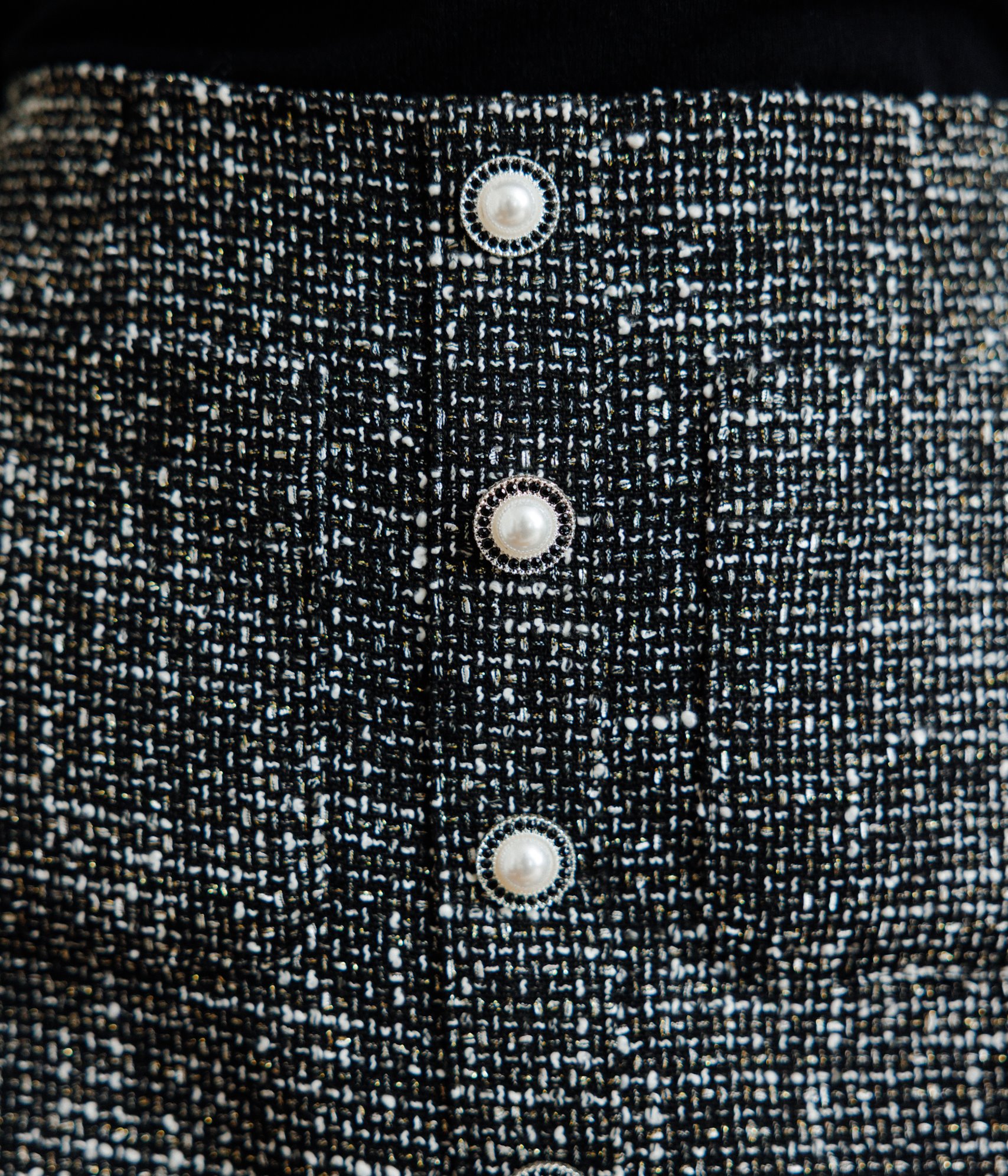 Jupe trapèze courte en tissu chiné avec boutons fantaisie. Coupe courte légèrement trapèze. Boutons fantaisie façon bijoux avec perle et strass. Coloris chiné. Matière façonnée et doublée. Sans ceinture. Pinces en haut au dos pour le cintrage. Une jupe à associer à un pull uni et des bottes hautes.