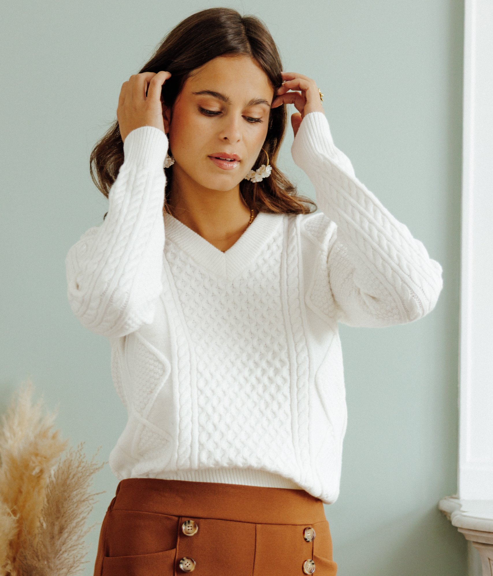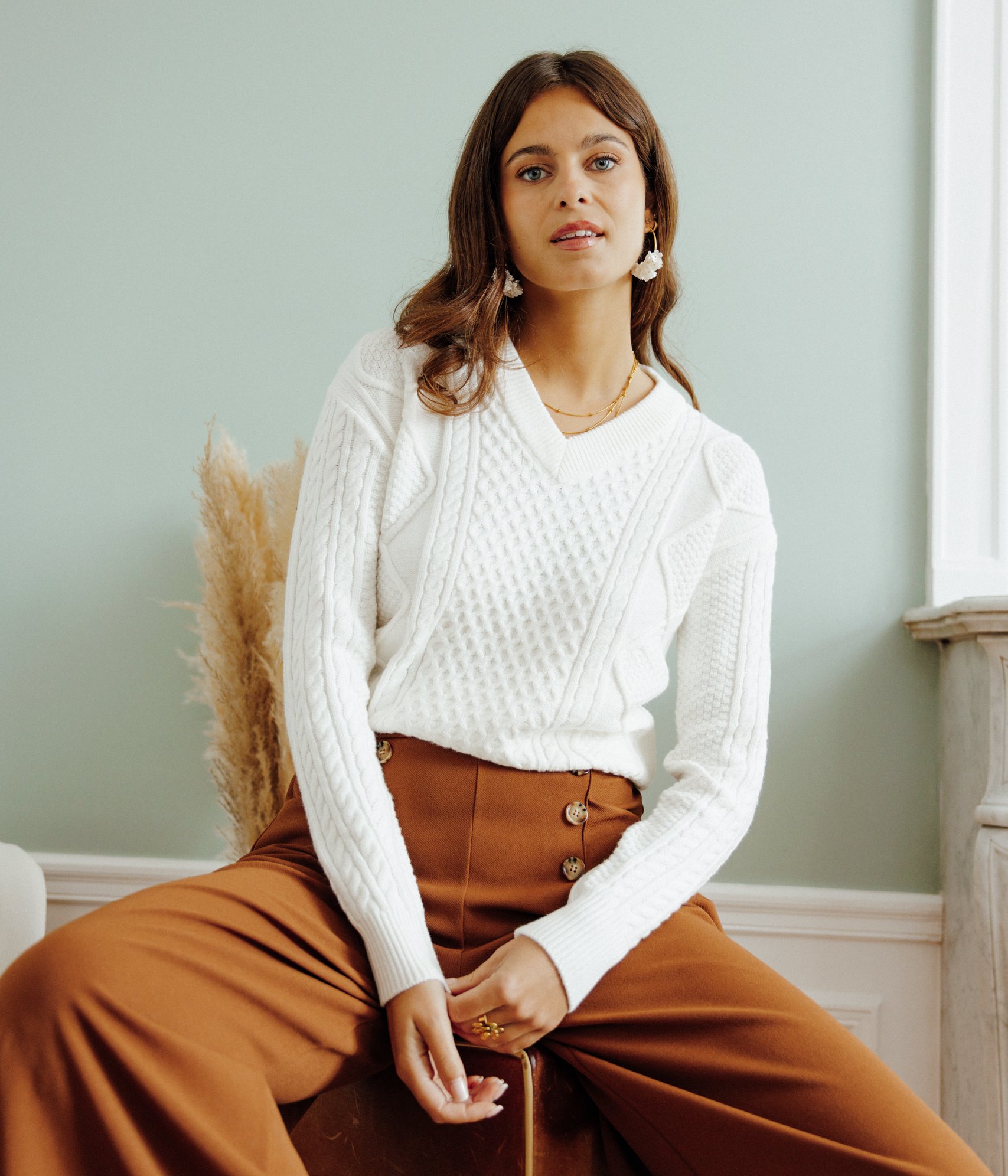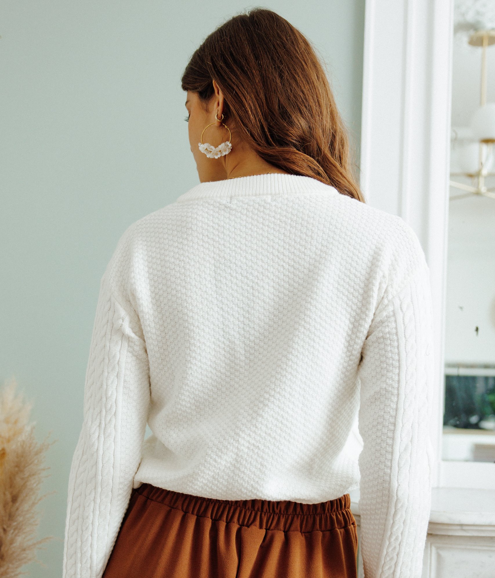 Notre mannequin Carla mesure 1m74 et porte un pull taille taille 36/S.