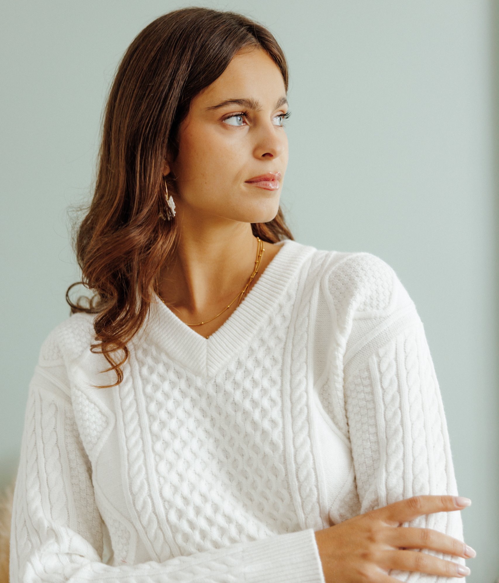 Pull en maille épaisse unie à manches longues et col V. Coupe droite. Manches longues. Col V. Coloris uni. Tissu en maille épaisse texturée avec torsades aux manches et mix motifs en relief sur le buste devant. Large bord-côte en finition du col, de la base et des poignets. Base droite.