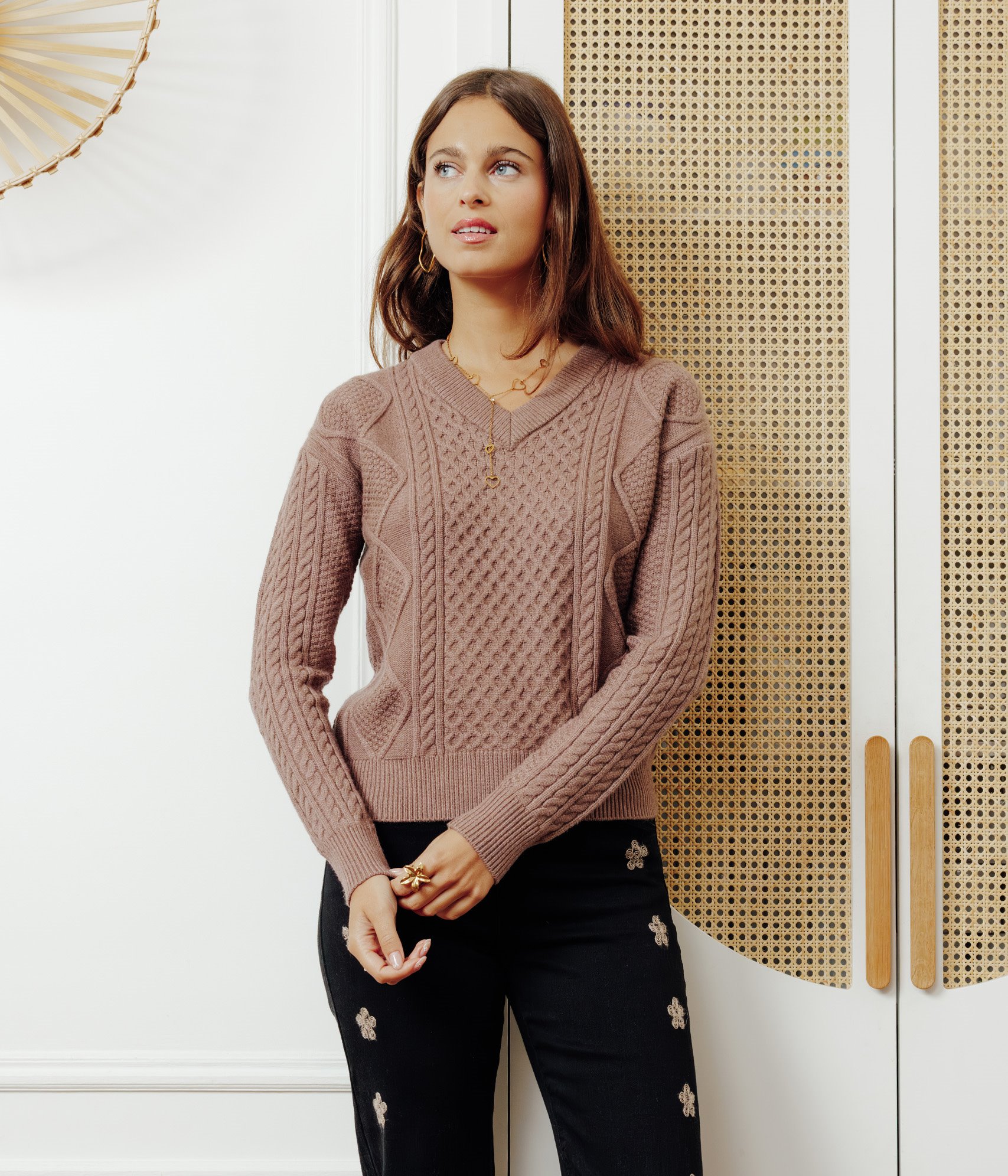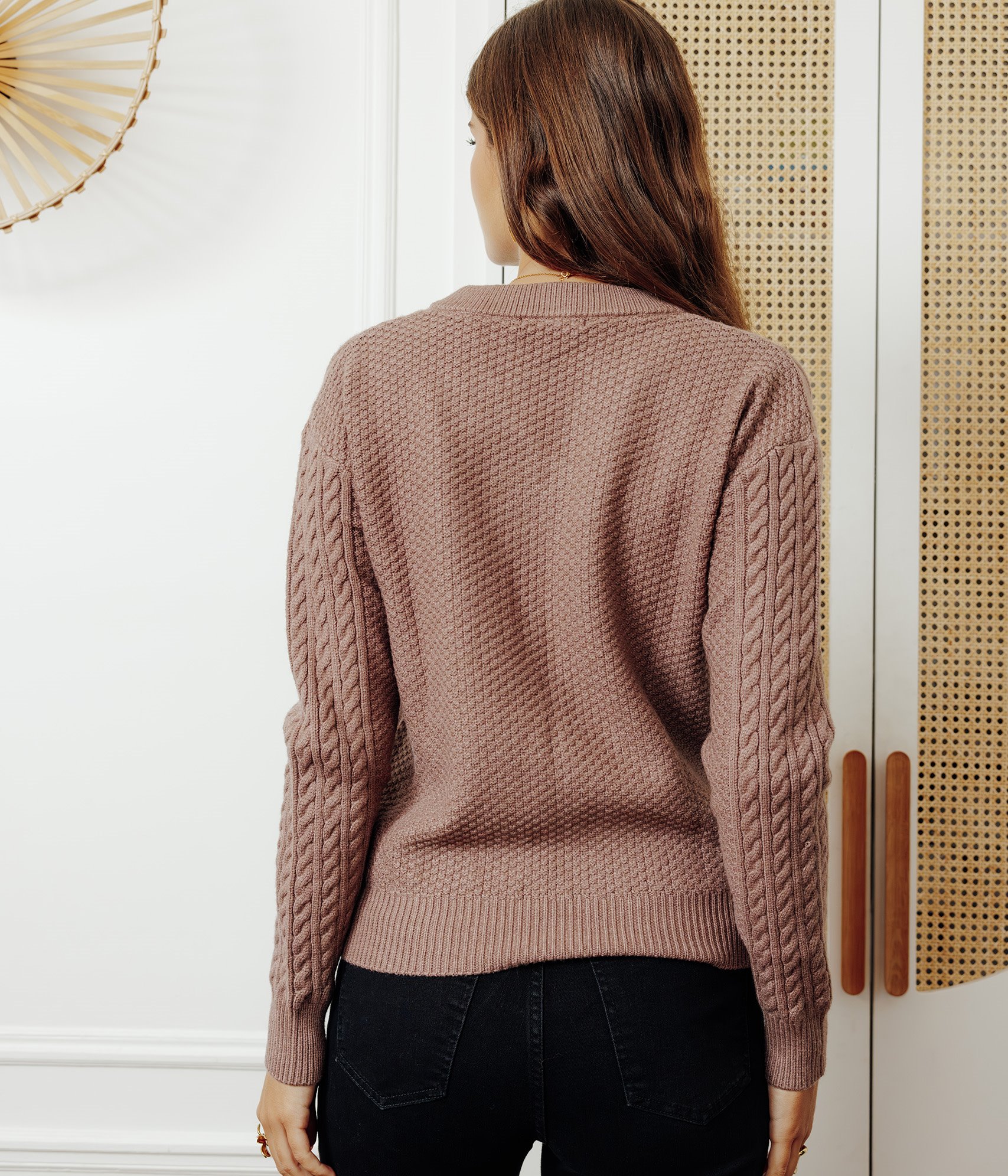 Pull en maille épaisse unie à manches longues et col V. Coupe droite. Manches longues. Col V. Coloris uni. Tissu en maille épaisse texturée avec torsades aux manches et mix motifs en relief sur le buste devant. Large bord-côte en finition du col, de la base et des poignets. Base droite.