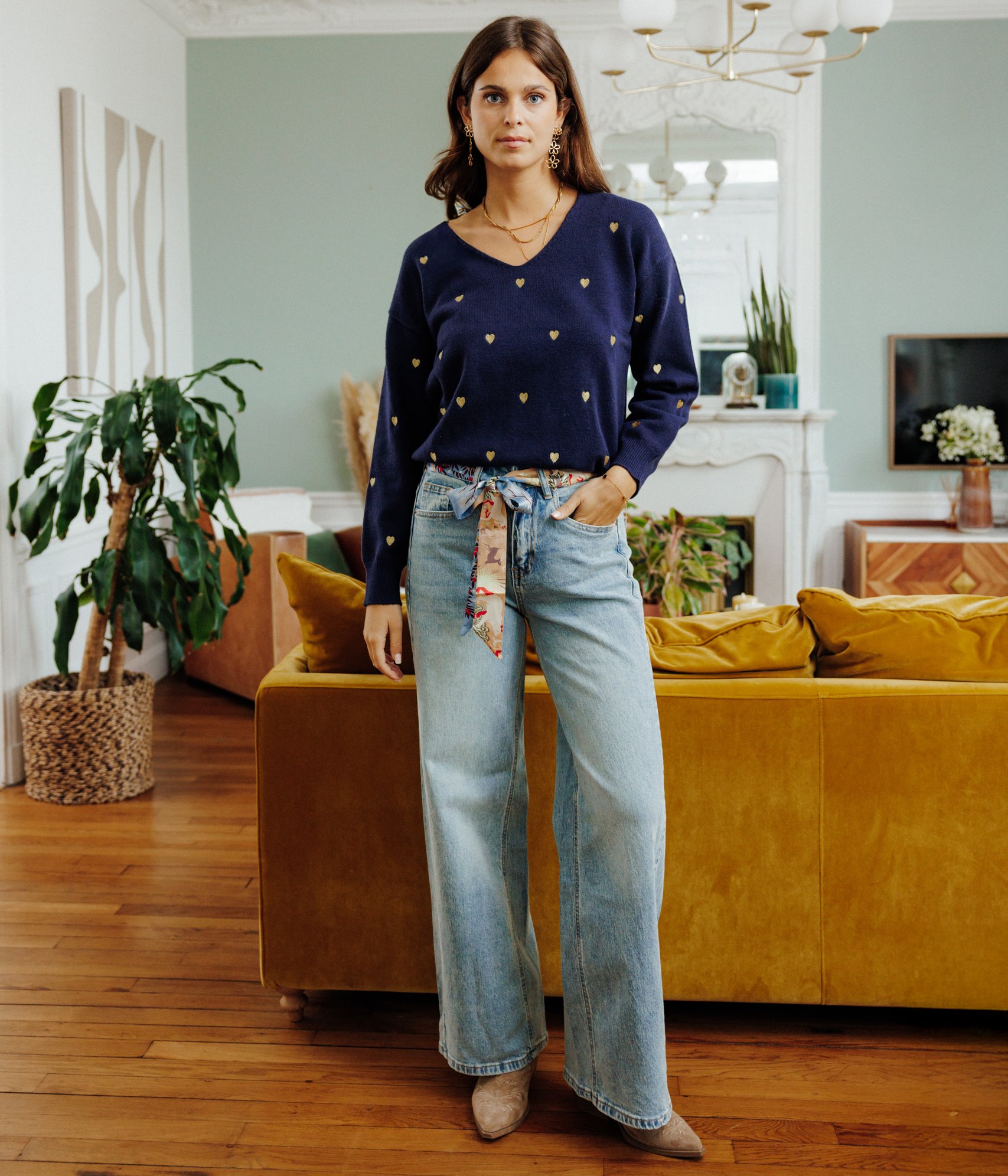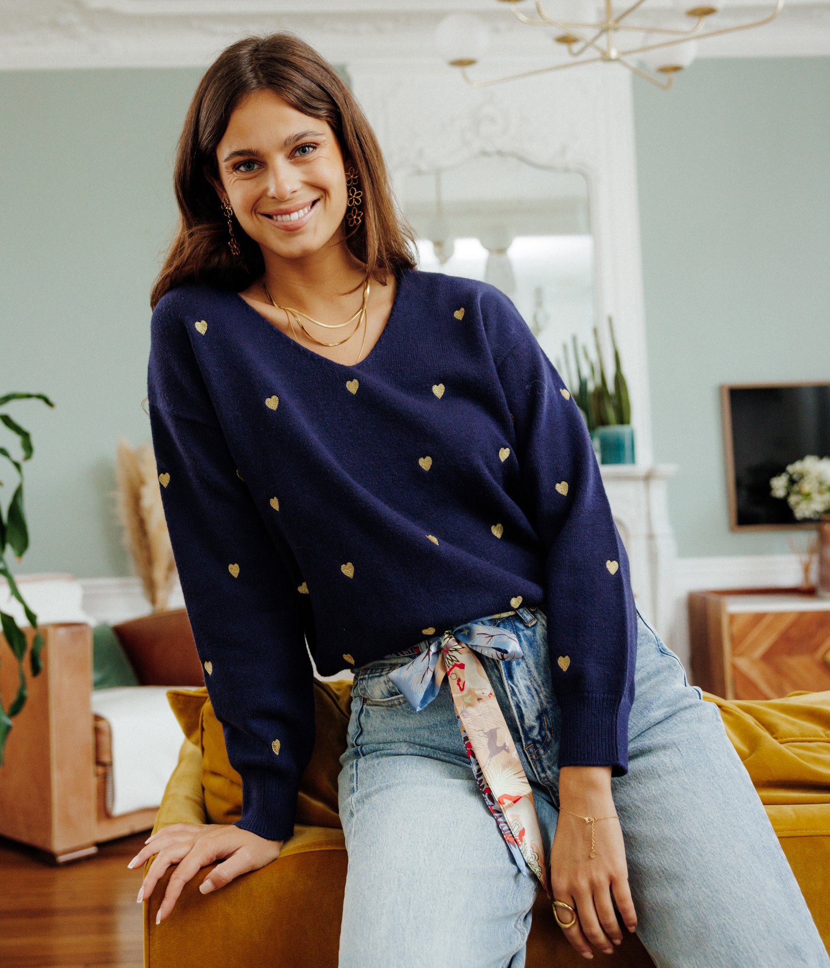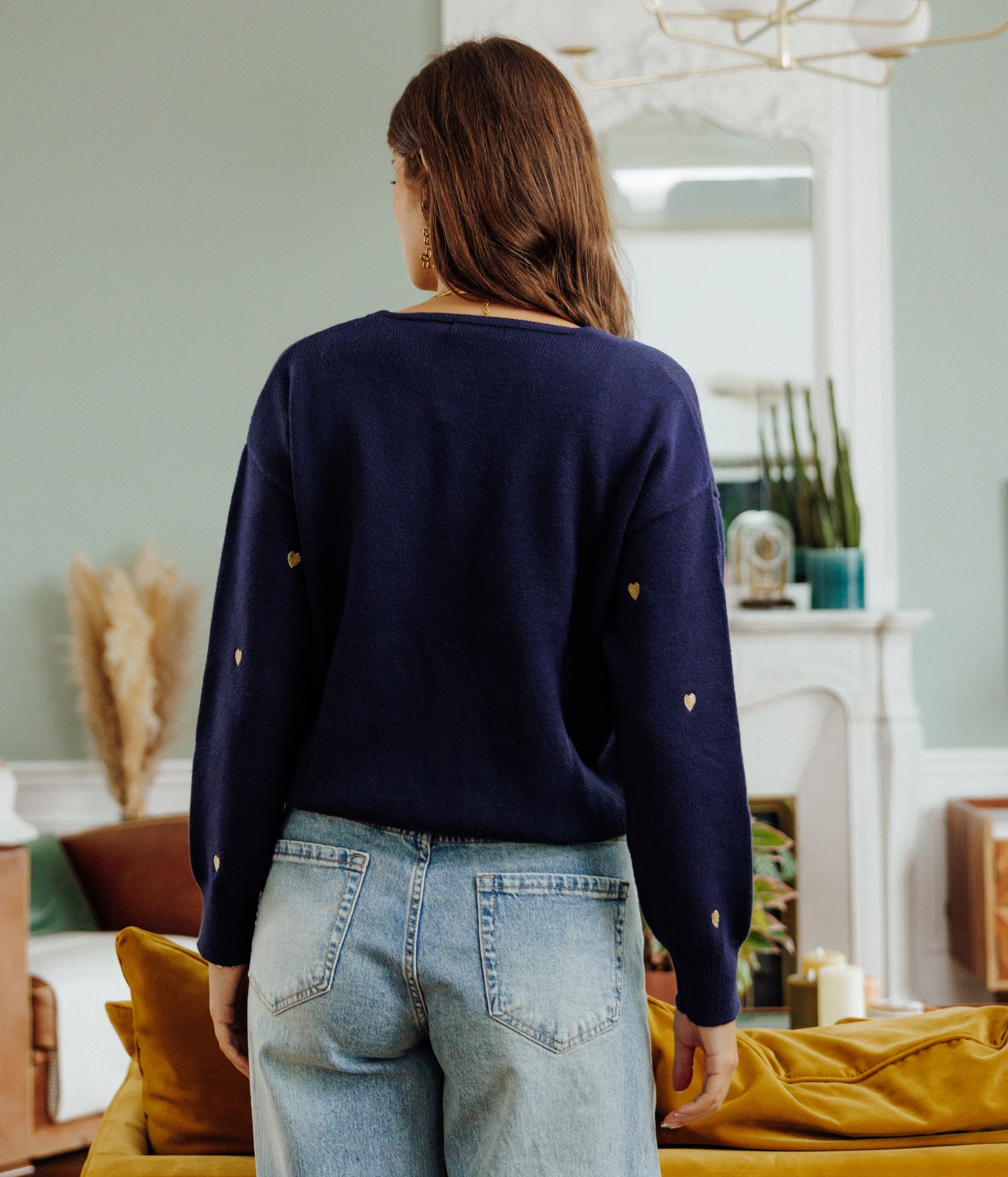 Pull à manches longues et col V en maille épaisse brodée de cœurs contrastés. Coupe droite. Manches longues montées sur des emmanchures tombantes. Décolleté V. Tons bicolores avec cœurs brodés devant et aux manches. Dos uni. Tricot épais en maille jersey. Finitions poignets et base en côtes.