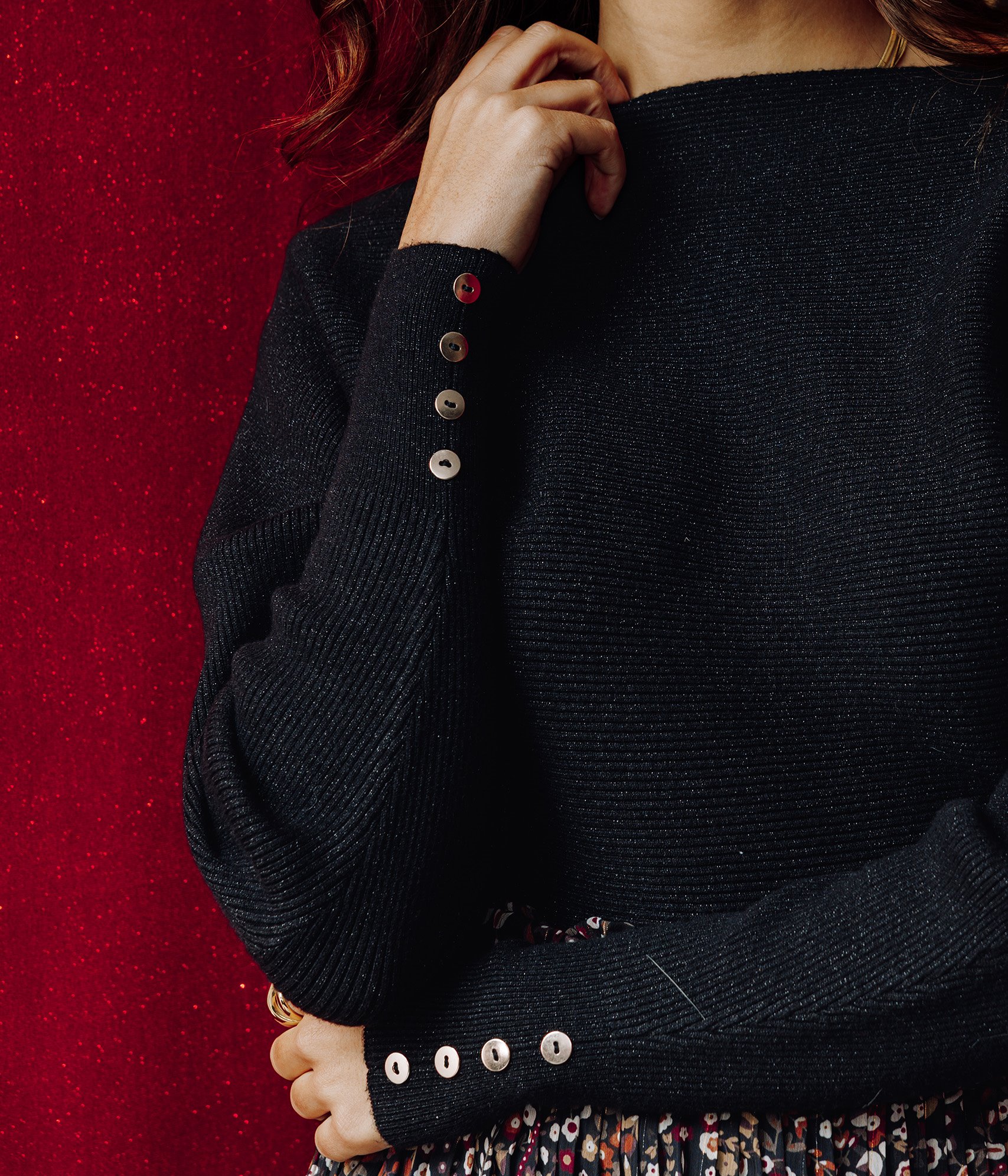 Pull cintré manches chauve-souris à boutons décoratifs. Coupe ajustée à la taille. Manches longues chauve-souris. Sans emmanchures. Col bateau. Coloris uni. Maille fine en côtes tricotées à l'horizontale devant, dos et manches. Découpe ajustée à la taille en côtes verticales. 4 boutons contrastés cousus sur le dessus des poignets.