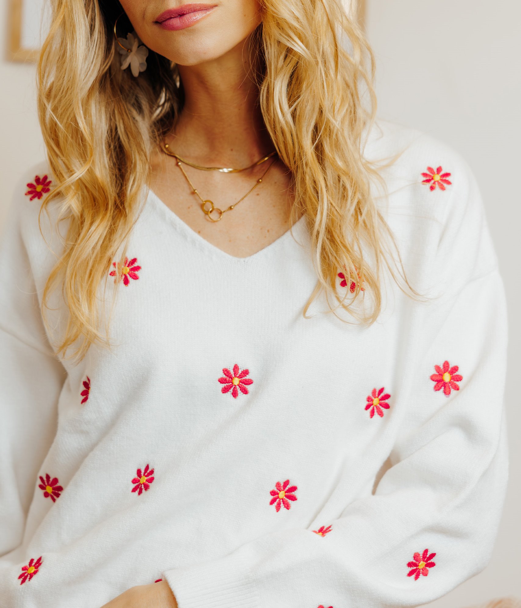 Pull col V avec fleurs brodées. Coupe droite ample. Manches longues à emmanchures basses. Col V. Fleurs bicolores brodées sur le devant. Maille épaisse. Finitions bords-côtes à la base et aux poignets. Portez ce pull à fleurs avec un jean et des bottines à talons.
