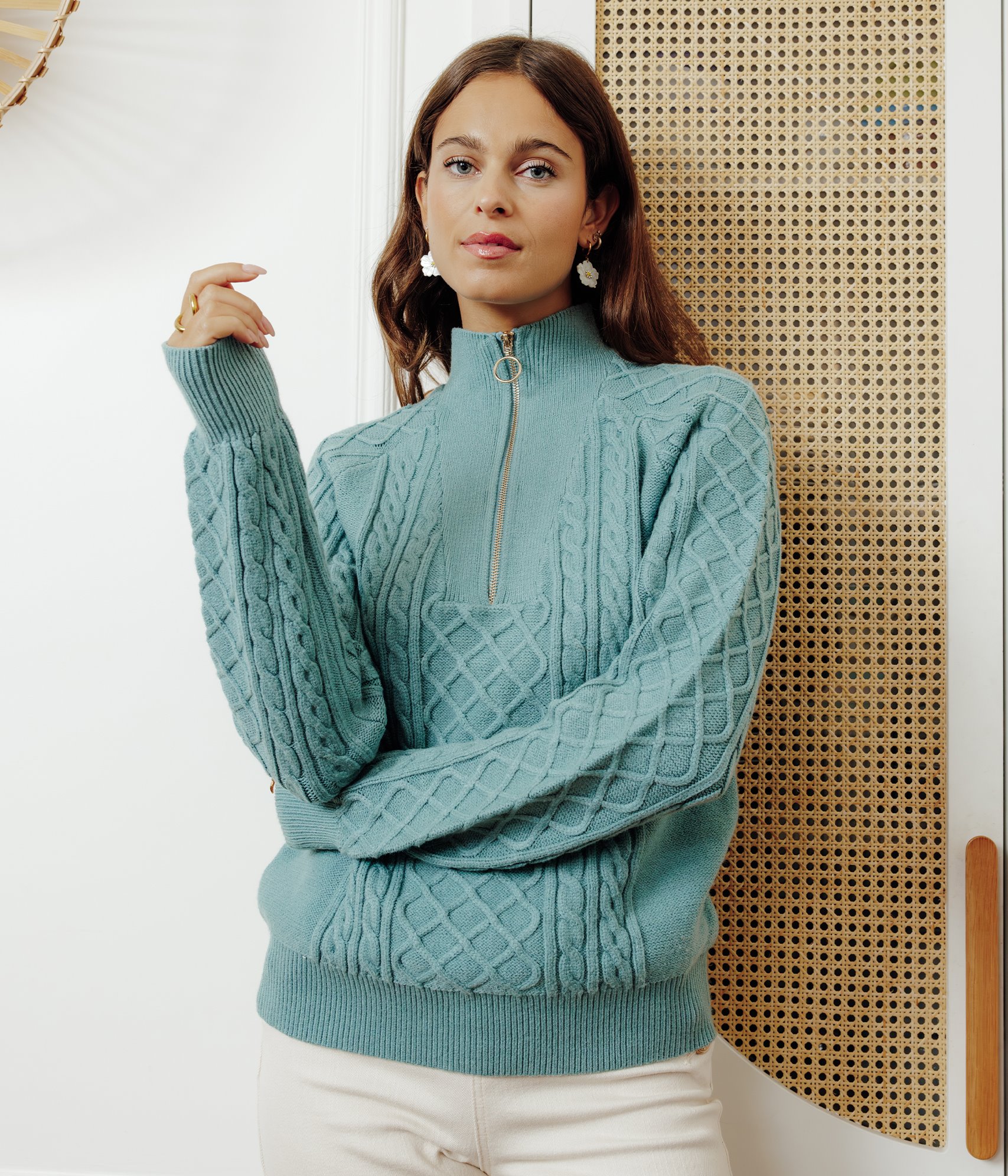 Restez bien au chaud avec ce pull en maille torsadée. Pull à col camionneur en maille torsadée. Coupe droite. Manches longues à emmanchures raglan. Col montant fermé par un zip. Maille unie. Motifs torsades et câbles sur l'ensemble du modèle. Boucle métallique en finition du zip. Finitions bords-côtes à la base, au col et aux poignets.