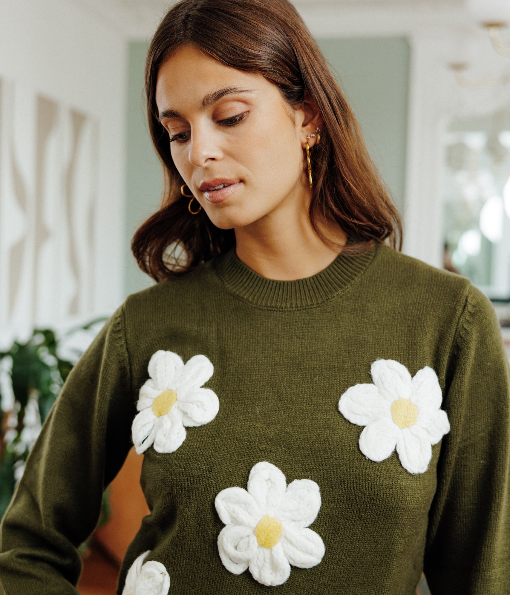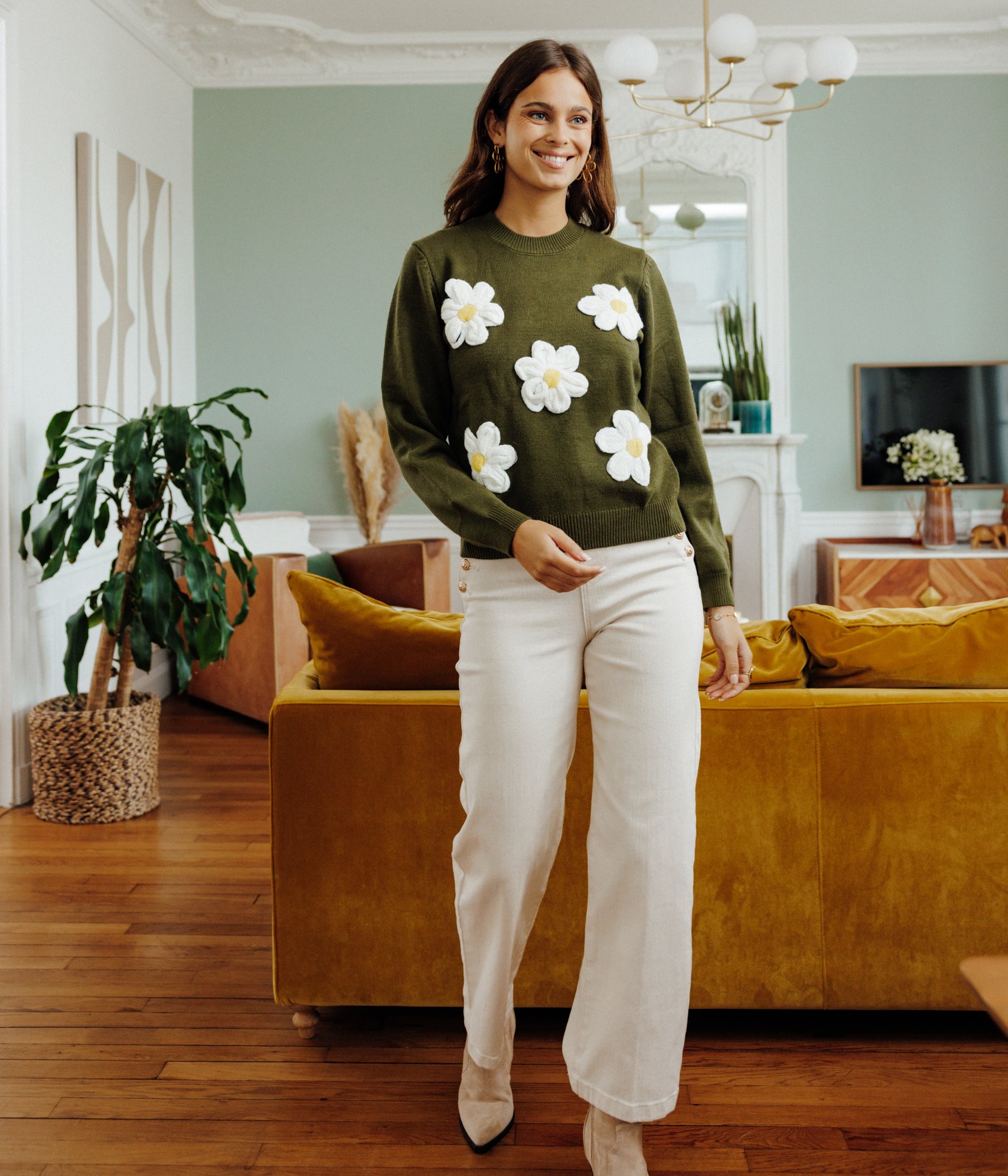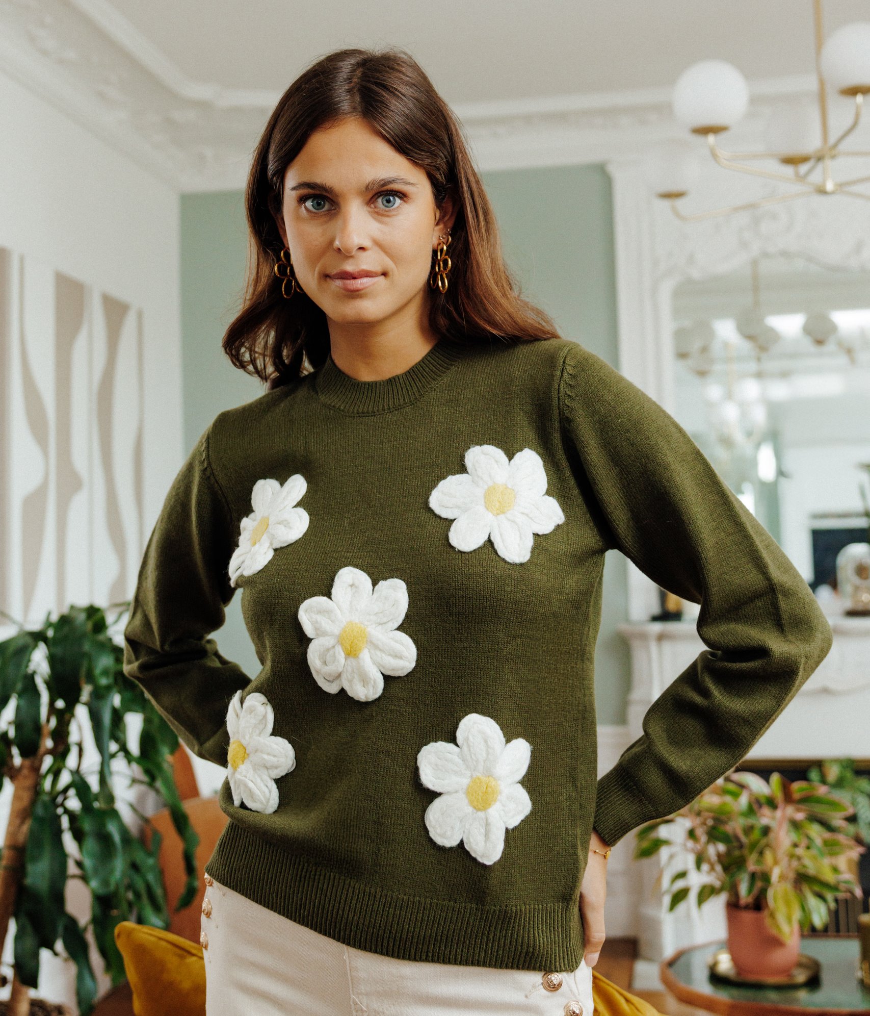 Pull à manches longues avec grosses marguerites en relief. Coupe droite. Manches longues. Emmanchures droites. Col rond ras de cou. Teinte unie avec 5 grosses marguerites en relief en tricot bicolore contrasté appliquées devant. Maille jersey épaisse. Col, poignets et base en côtes. Base droite.