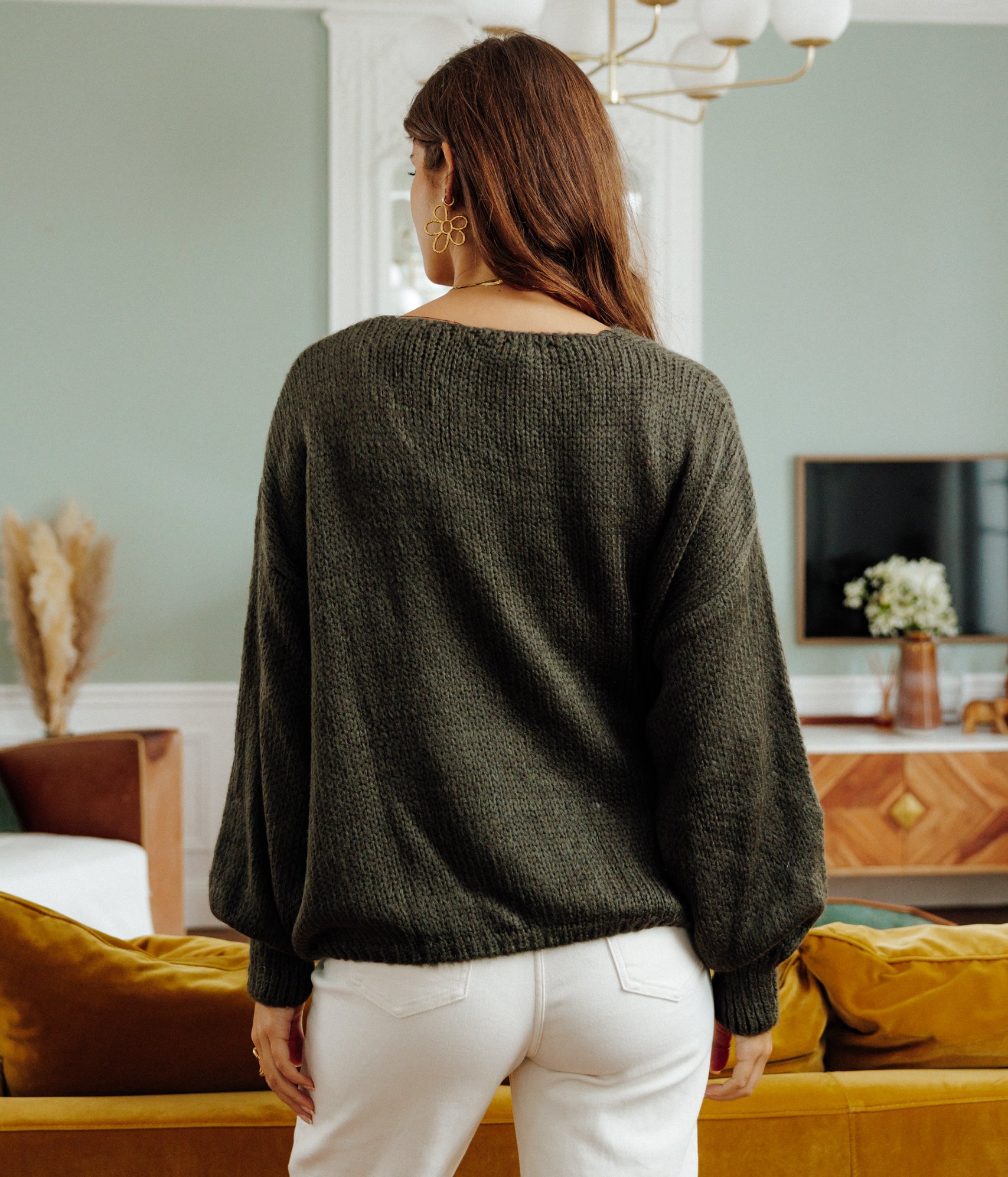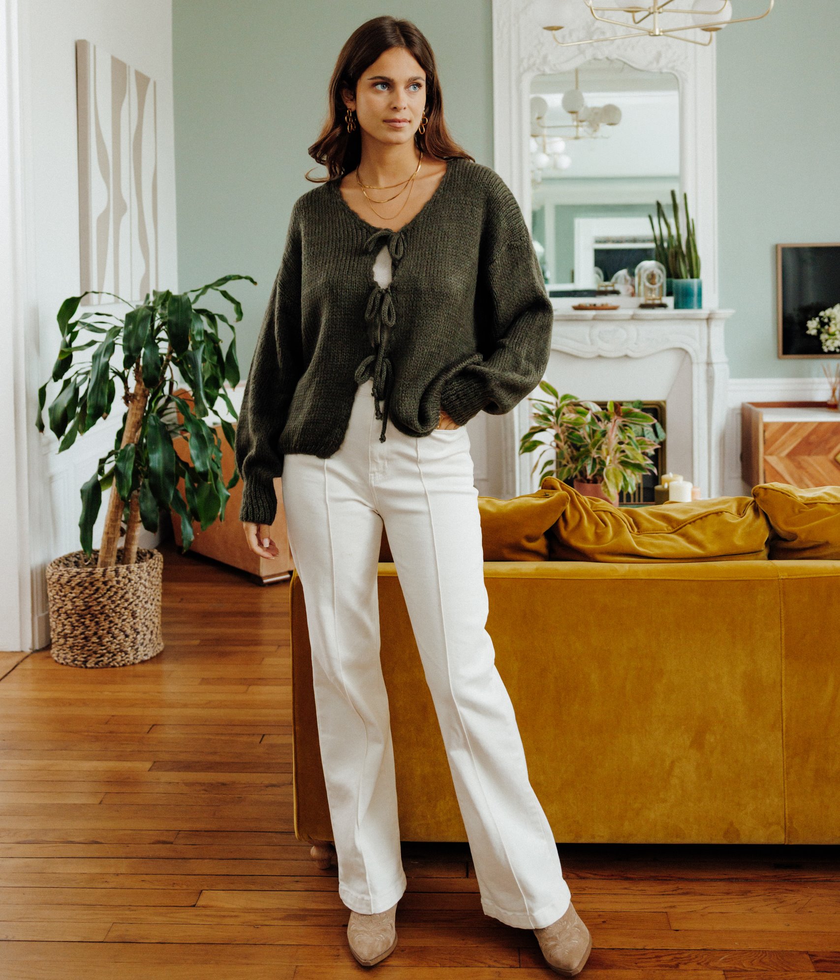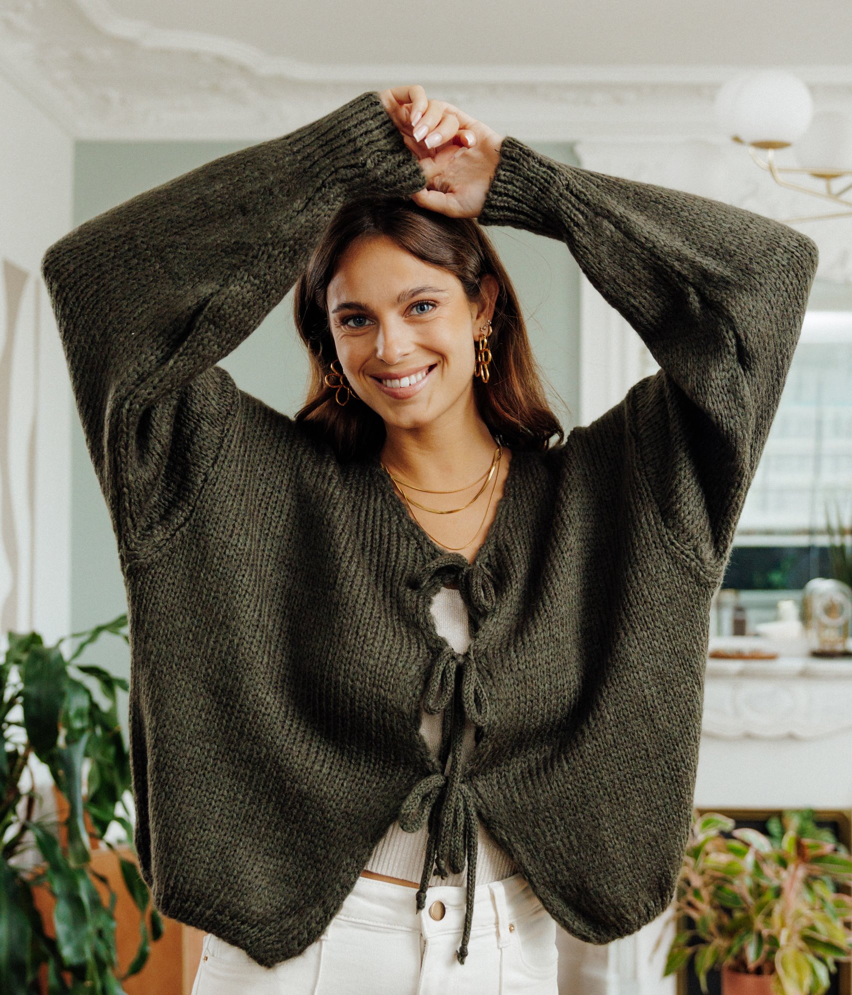 Gilet ample à manches longues et fermeture à nouer. Coupe large fluide. Manches longues bouffantes. Emmanchures tombantes. Col V. Fermeture devant par 3 nouettes. Teinte unie. Tricot en maille jersey. Poignets et base en côtes. Base droite. Espace ouvert entre chaque lien de fermeture. Composition contenant de la laine.