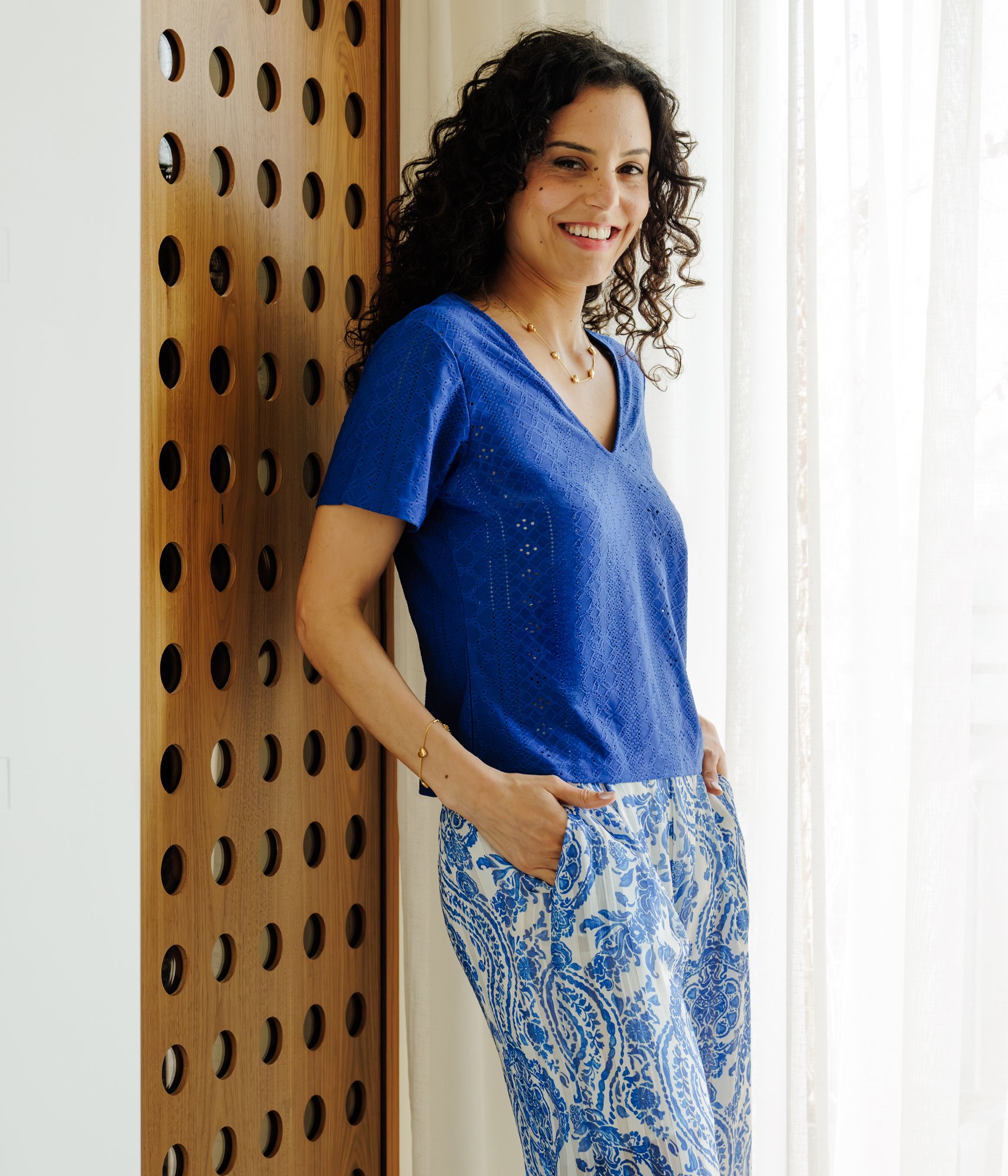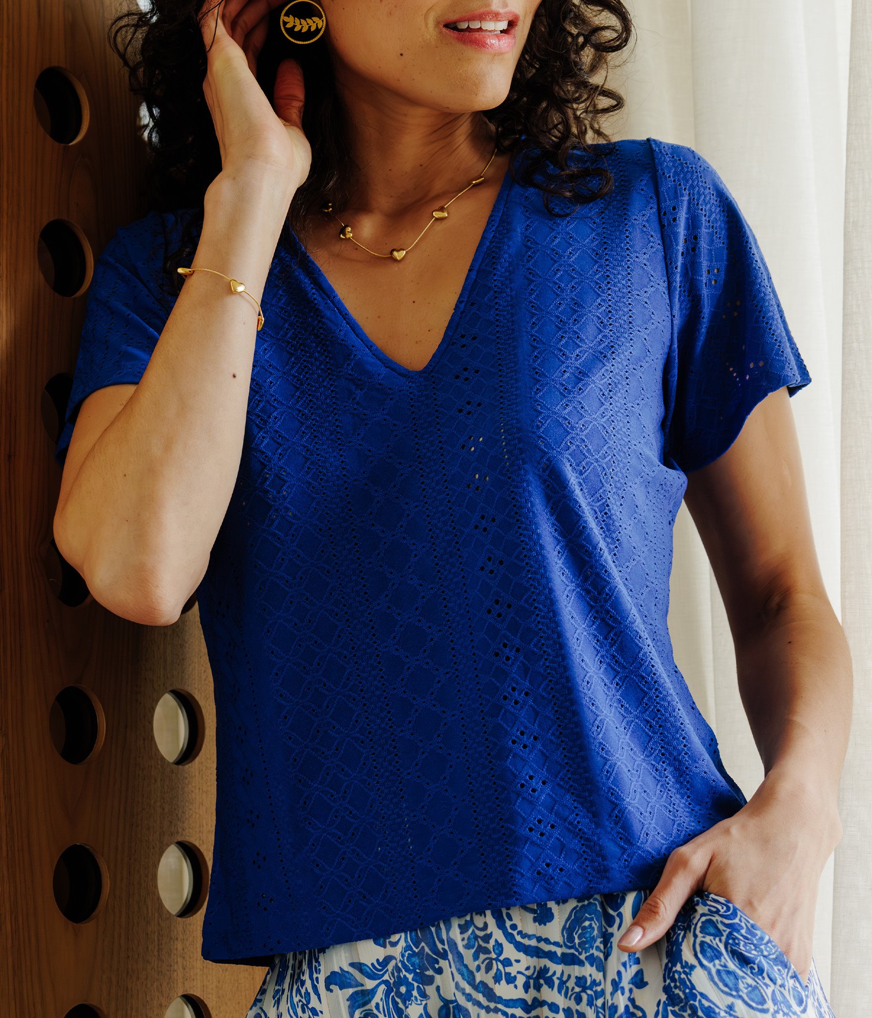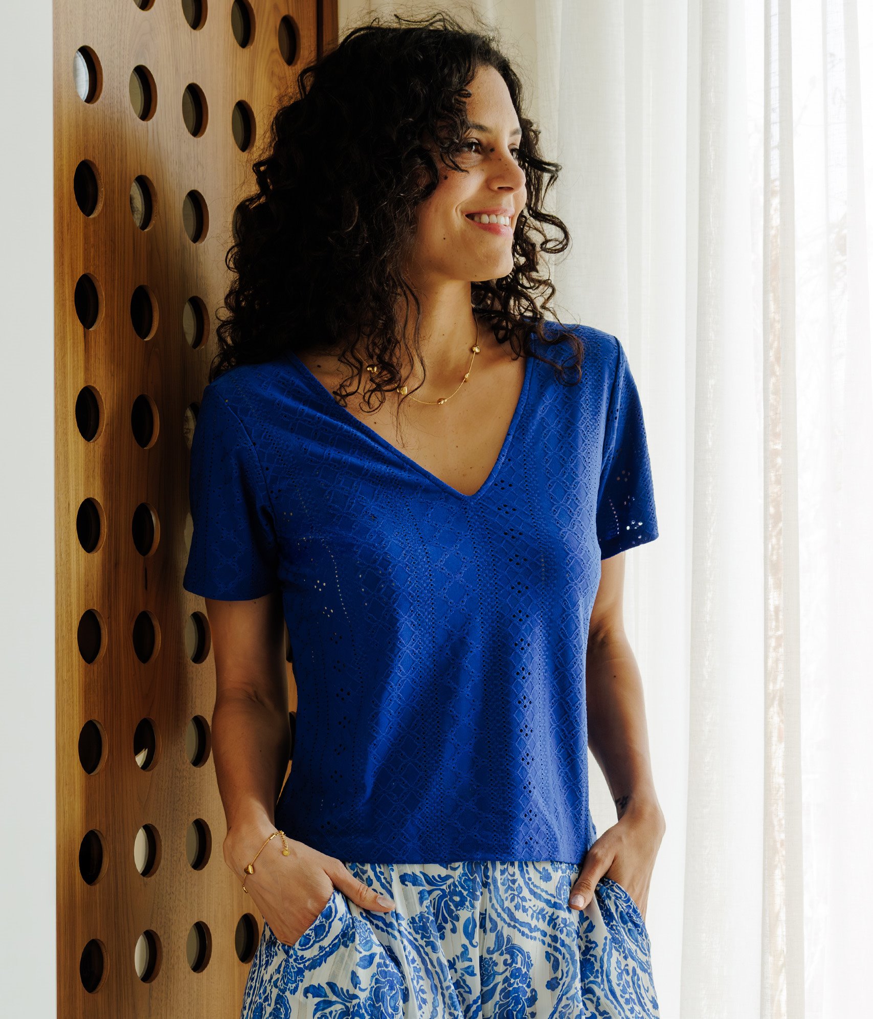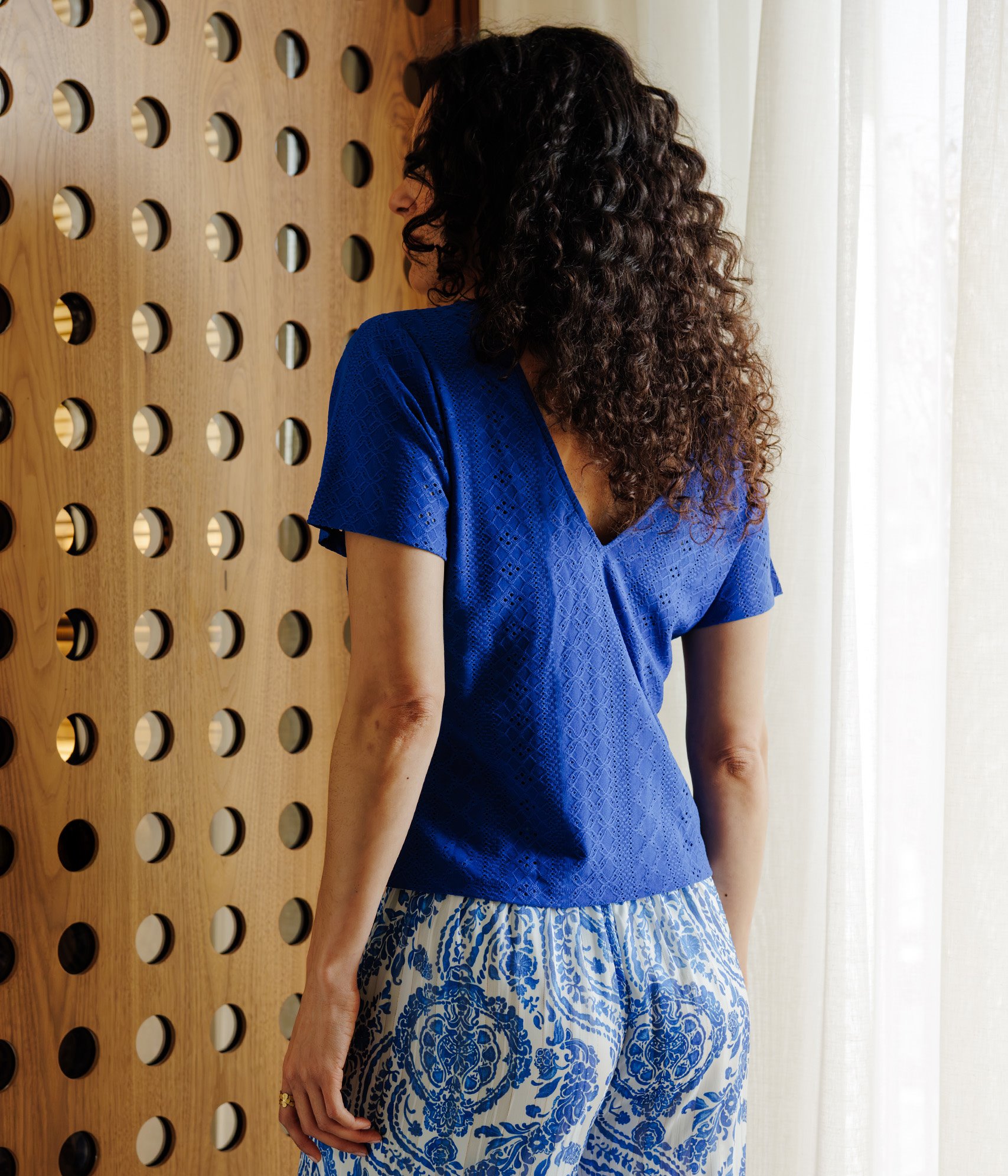 T-shirt à manches courtes avec col en V. Coupe droite. Détails en broderie sur l'ensemble du modèle. Manches courtes avec emmanchures droites. Longueur au niveau de la taille. Finition des bords en surpiqûres.