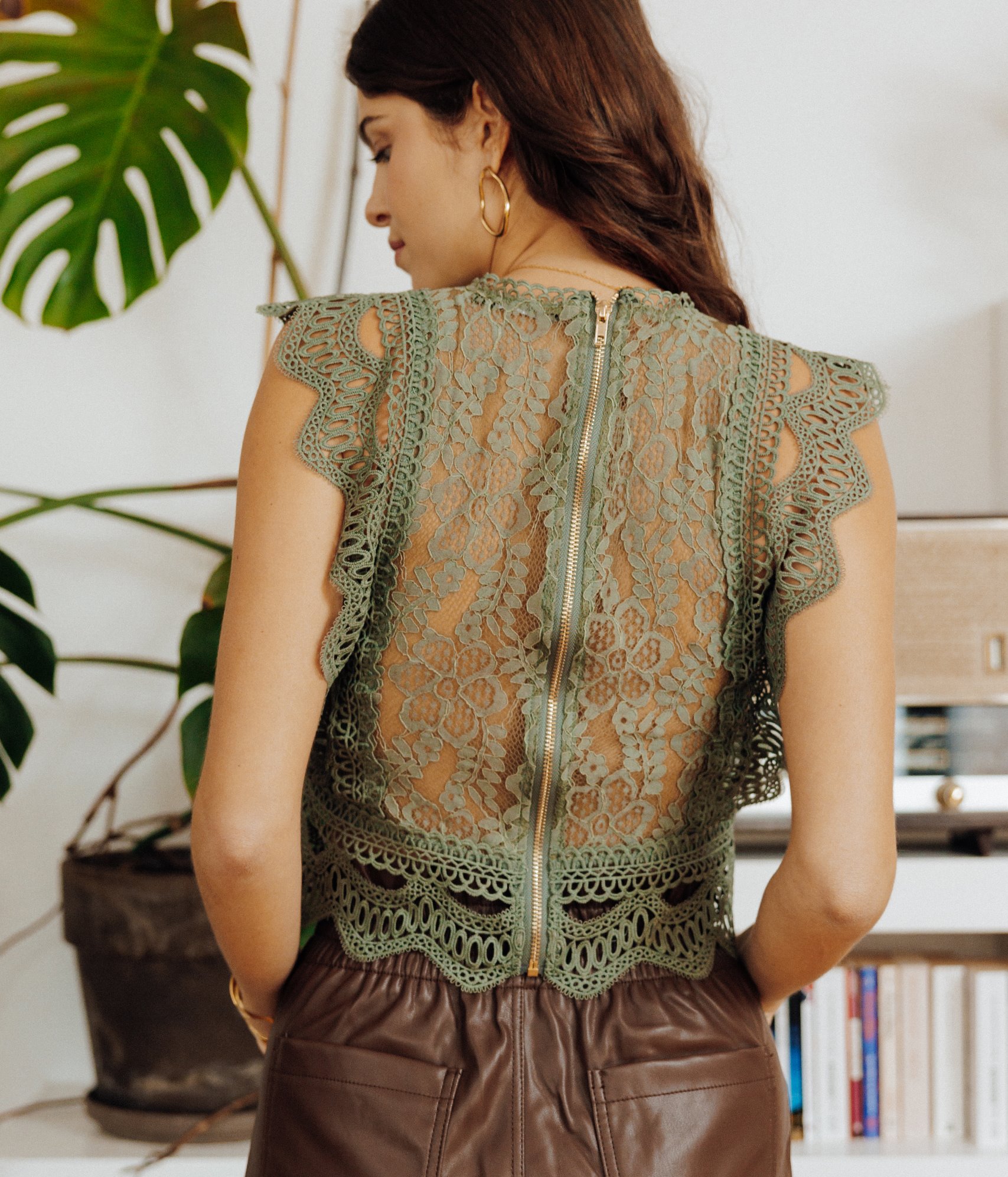 Blouse en dentelle unie sans manches et col rond. Coupe droite légèrement ajustée. Modèle sans manches. Col rond. Fermeture zippée métallique apparente au dos. Coloris uni. Tissu en dentelle à motif floral. Finition festonnée sur les emmanchures et à la base. Jeu de transparence sur le dos et les côtés. Base droite.