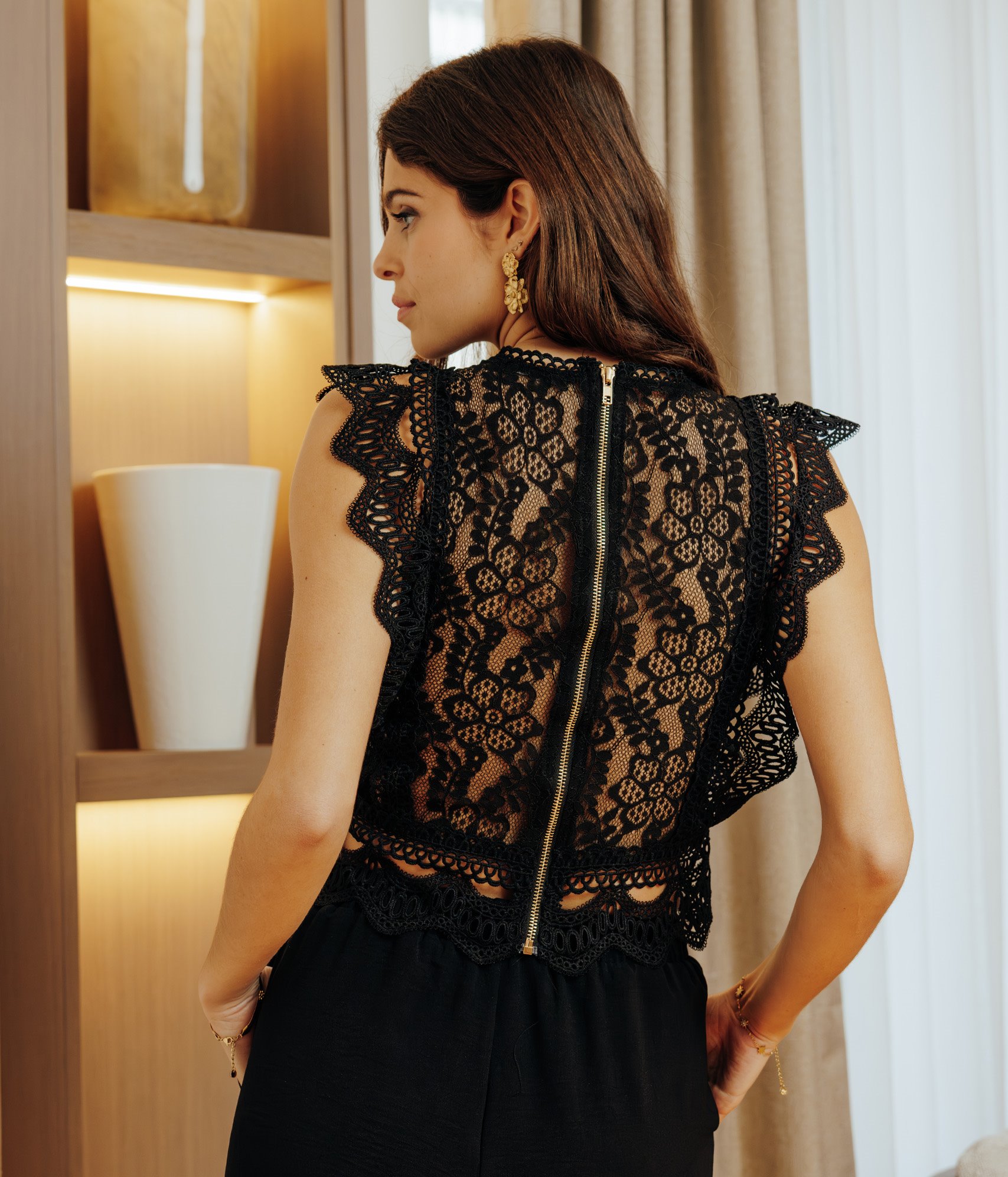 Blouse en dentelle unie sans manches et col rond. Coupe droite légèrement ajustée. Modèle sans manches. Col rond. Fermeture zippée métallique apparente au dos. Coloris uni. Tissu en dentelle à motif floral. Finition festonnée sur les emmanchures et à la base. Jeu de transparence sur le dos et les côtés. Base droite.