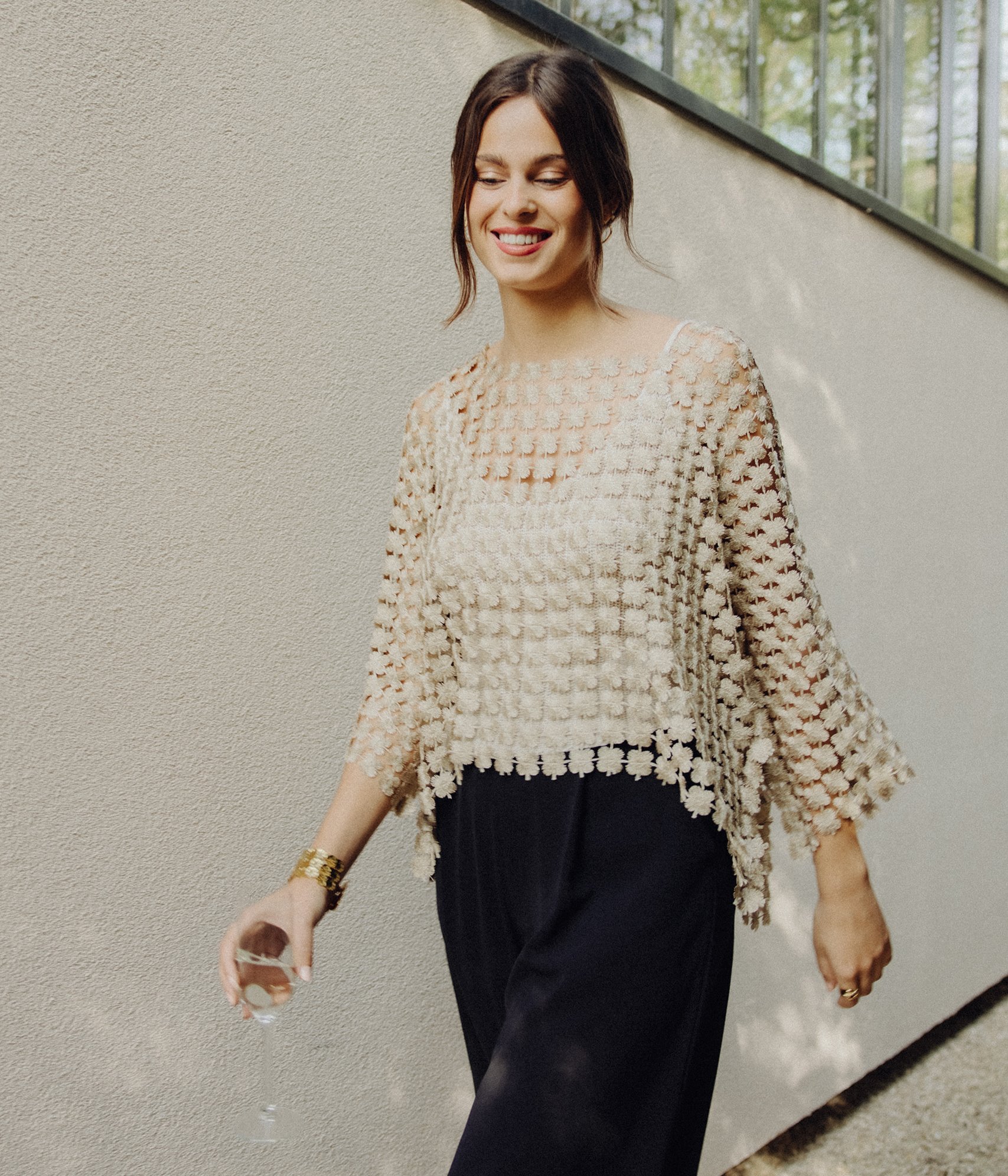 Top ample en dentelle unie à motifs floraux, manches 3/4 et décolleté carré. Coupe large fluide. Manches 3/4 sans emmanchures. Décolleté carré. Teinte unie à motifs fleurs ajourés. Dentelle non doublée. Base asymétrique à l'incurvé devant et au dos. Finitions brutes. À porter sur un débardeur ton sur ton pour un look léger et élégant.