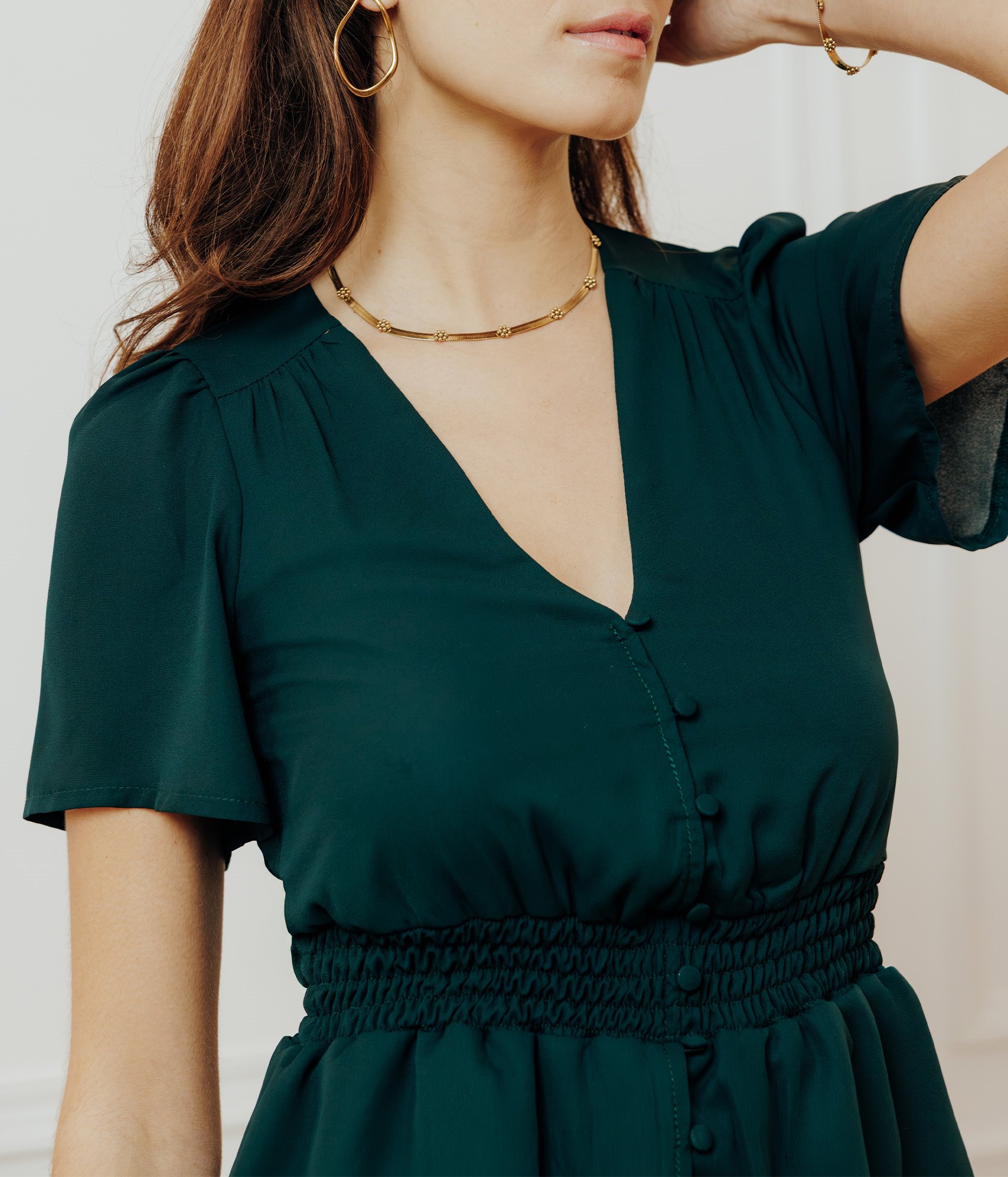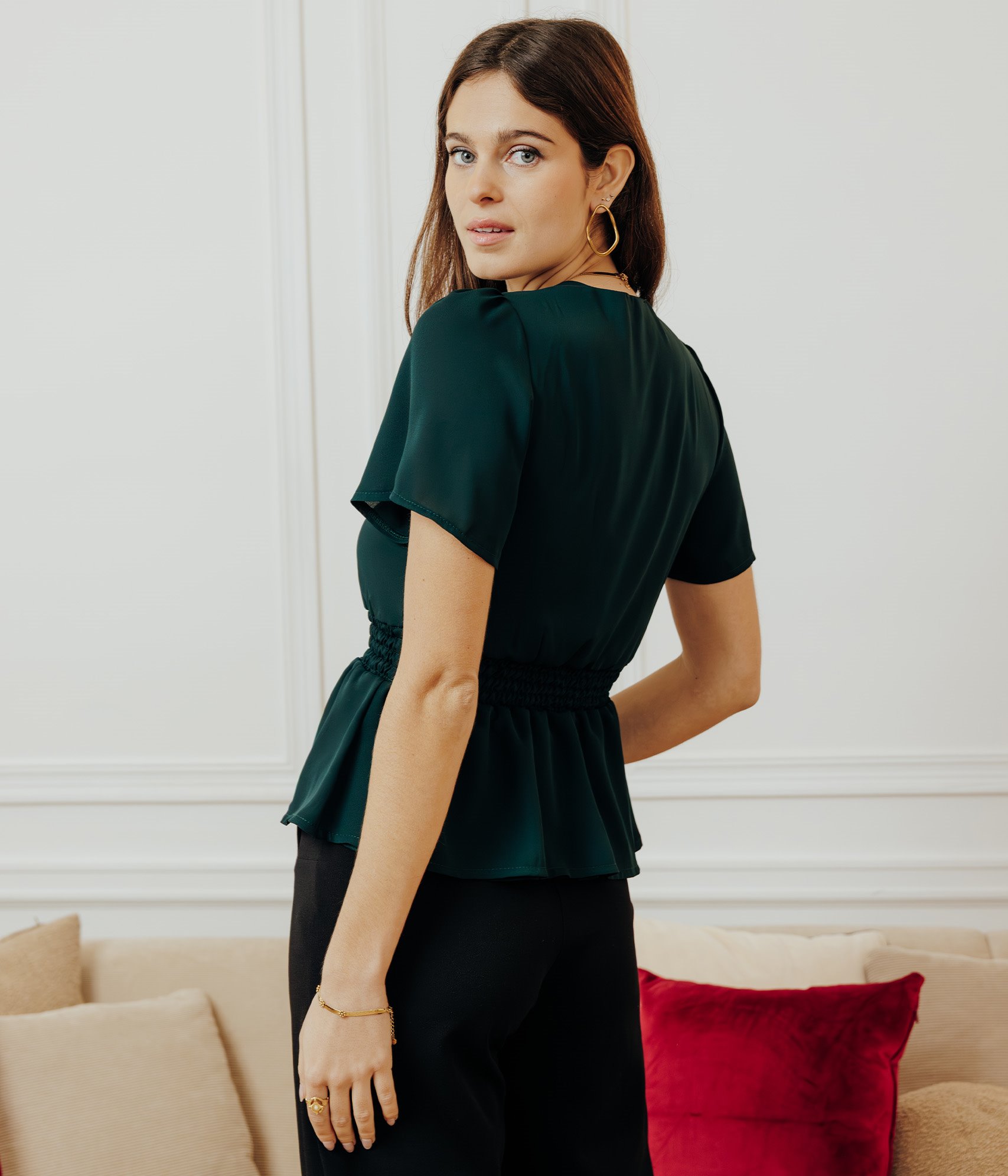 Blouse à manches courtes avec basque. Coupe cintrée. Manches volumineuses courtes. Emmanchures droites. Décolleté V. Fausse fermeture devant à petits boutons recouverts. Teinte unie. Matière fluide. Taille smockée. Fronces sous empiècements aux épaules devant et en haut des manches. Basque à la base.