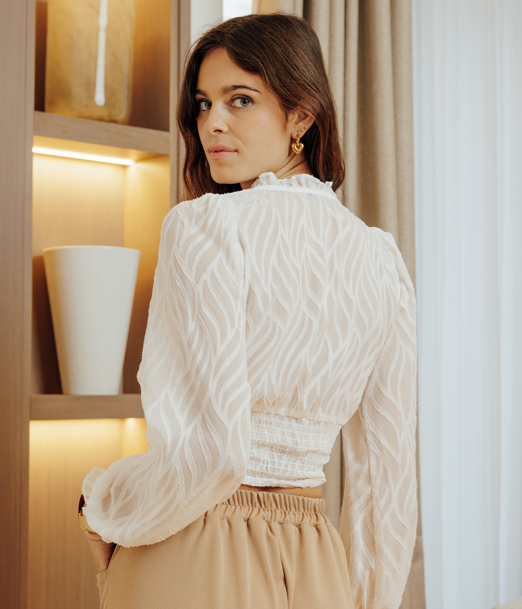 Blouse courte unie à manches longues aux touches transparentes. Coupe courte ajustée à la base. Manches longues. Col rond volanté. Fermeture par lien à nouer au col sur goutte ajourée. Coloris uni à motifs effet feuilles brodées. Devant en tissu opaque. Manches et dos semi-transparents. Base drapée devant façon corset. Base smockée au dos. Fronces sous la poitrine. Poignets élastiqués finis par un volant.