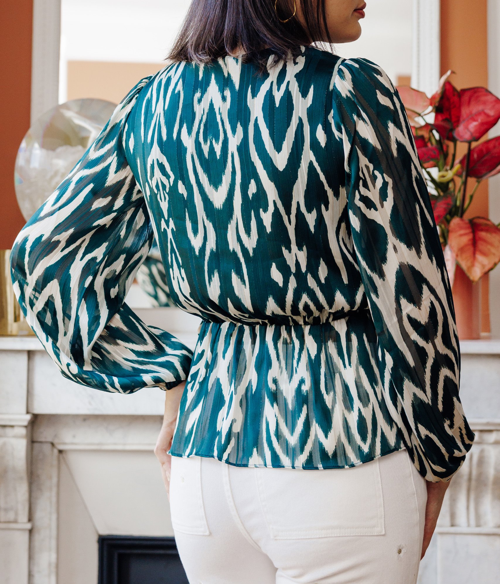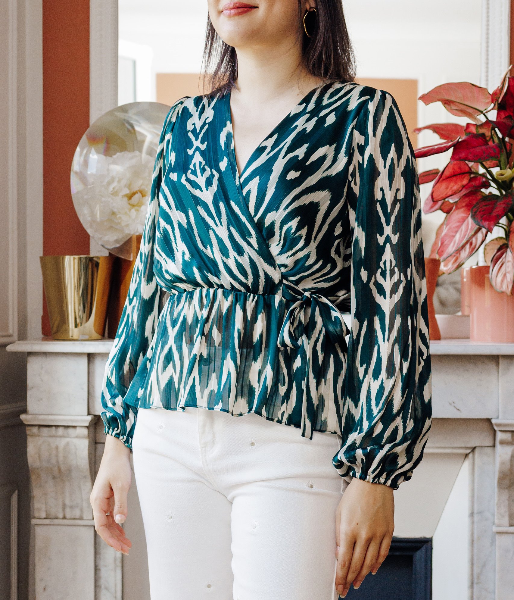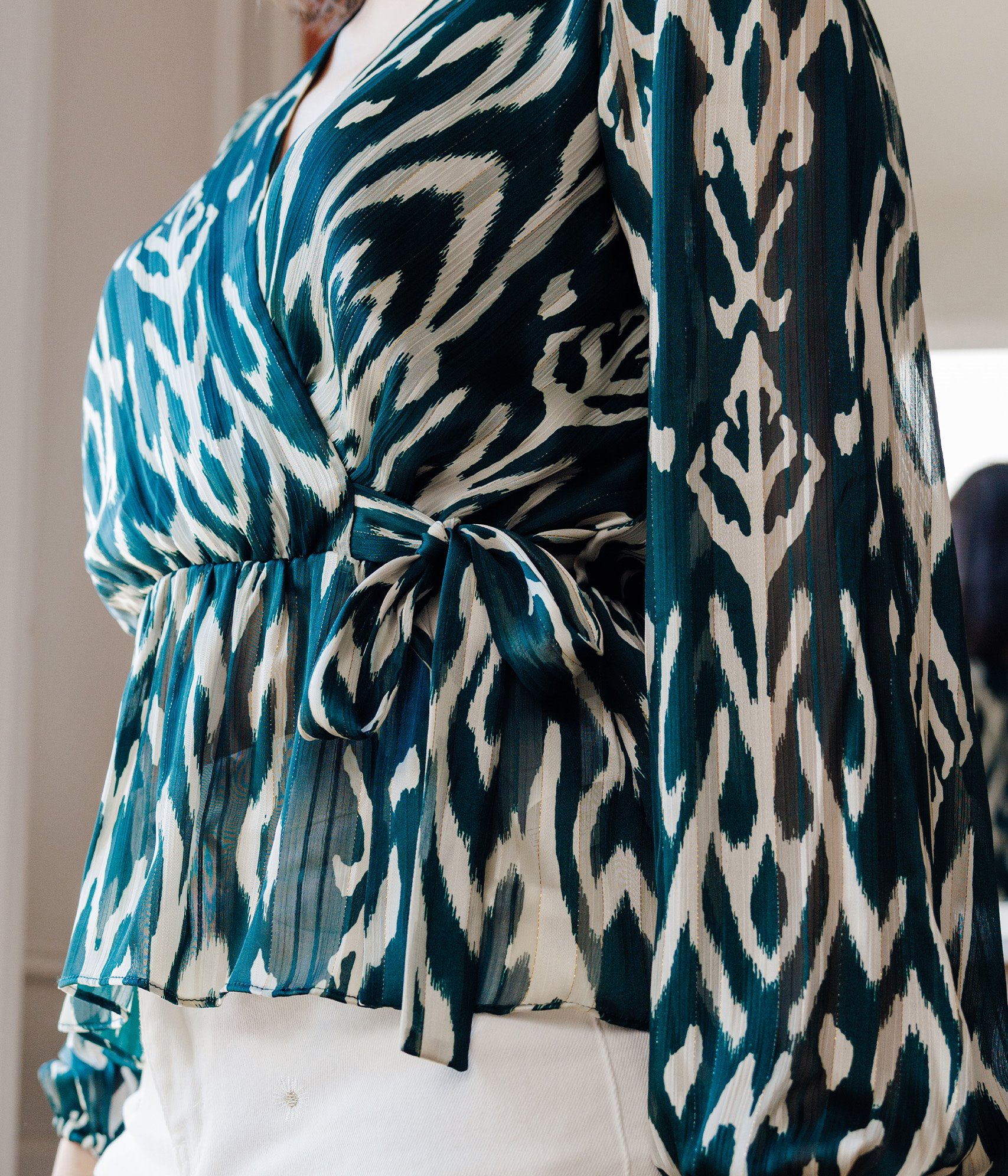 Blouse à manches longues inspiration cache-cœur à motifs baroques. Coupe cintrée. Manches longues bouffantes non doublées. Emmanchures droites. Décolleté croisé cache-cœur. Fermeture latérale par lien à nouer au-dessus de la taille. Tons bicolores à motifs baroques imprimés. Voile tissé de fils métallisés. Doublure devant et dos au-dessus de la taille. Base effet basque. Taille et poignets élastiqués.