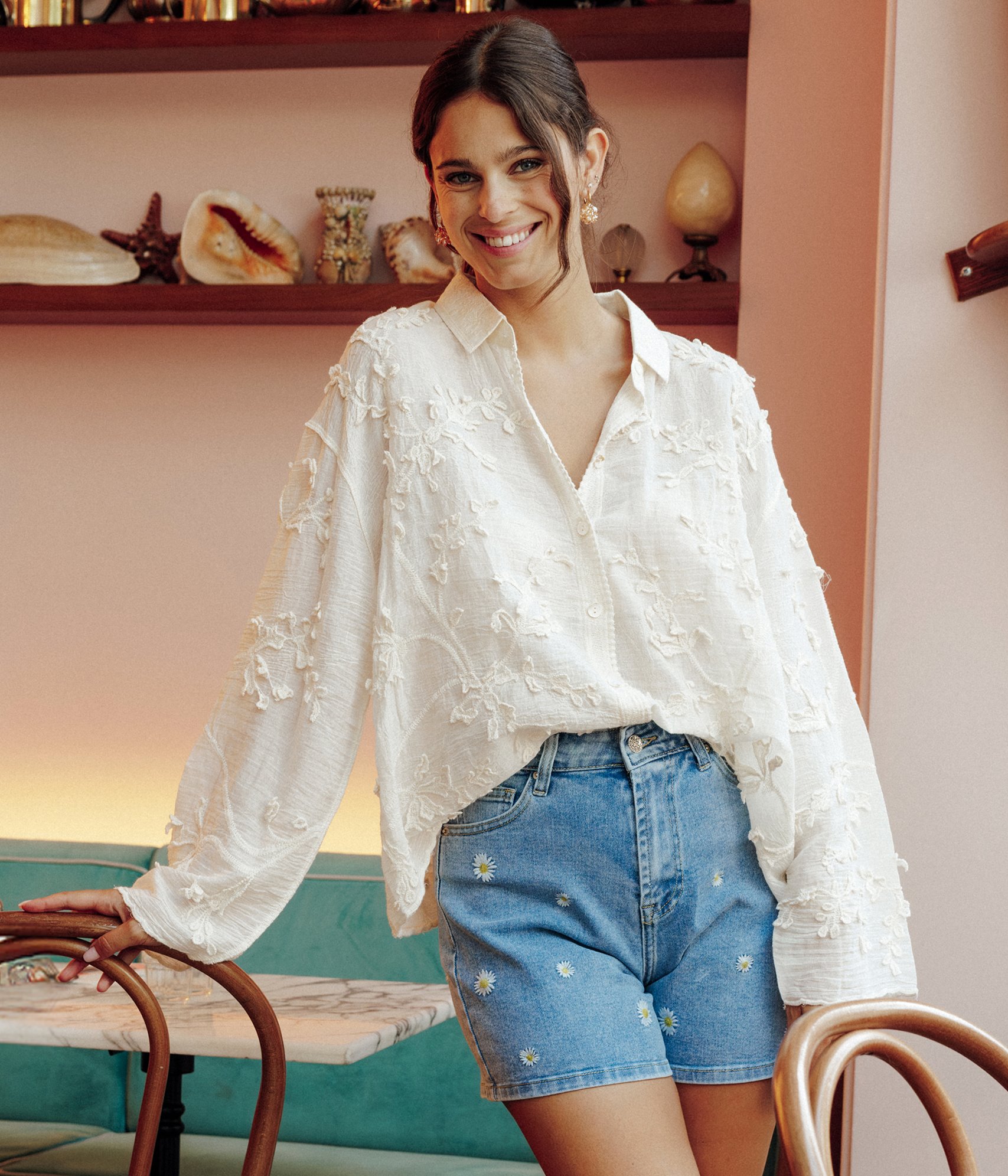 Chemisier avec motifs brodés à manches longues et col souple. Coupe ample légèrement évasée. Manches longues et amples avec emmanchures basses. Col chemise souple. Fermeture boutonnée devant. Motifs feuillage brodés appliqués. Tissu façon crêpe léger aspect lin. Finitions festonnées sur la patte de boutonnage, aux poignets et à la base.