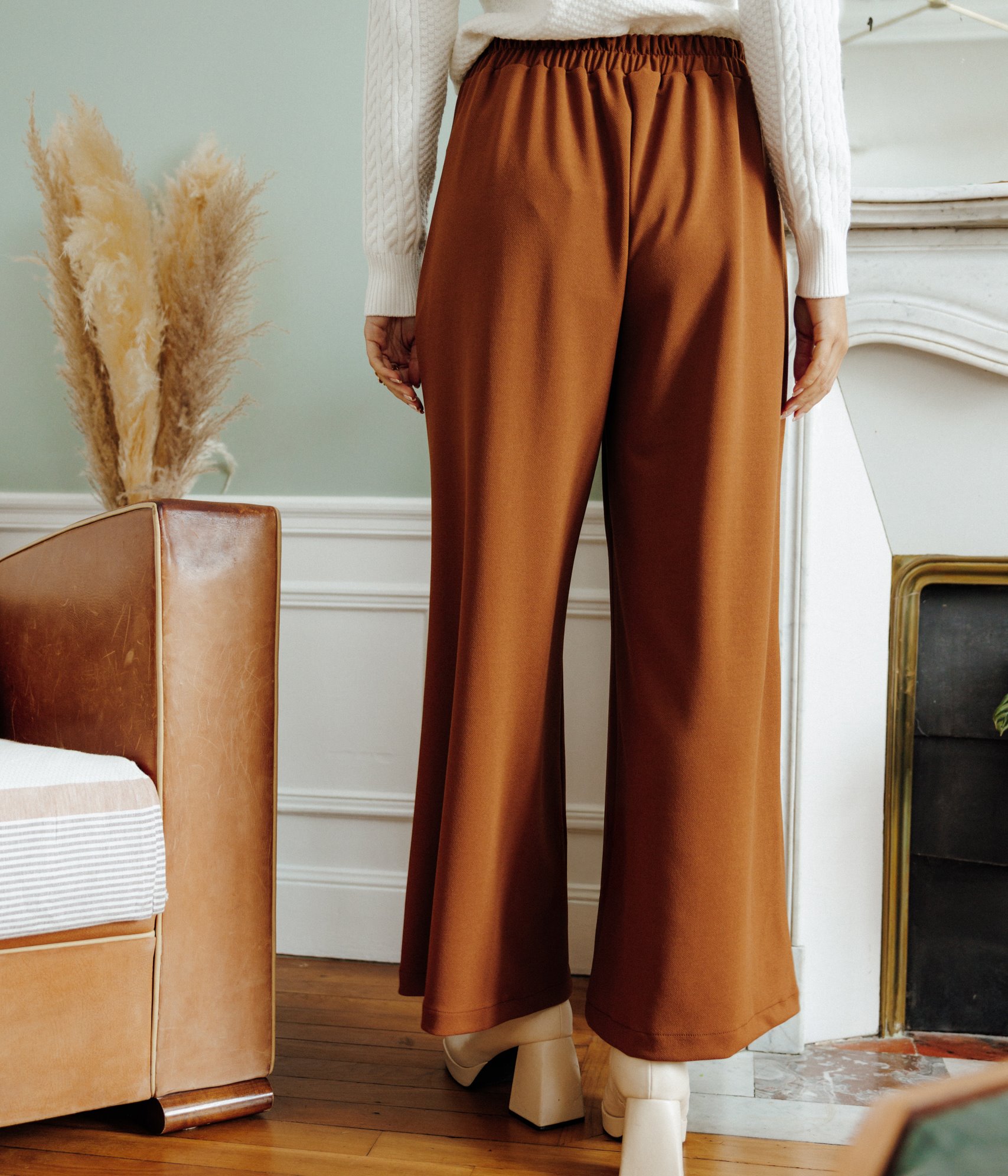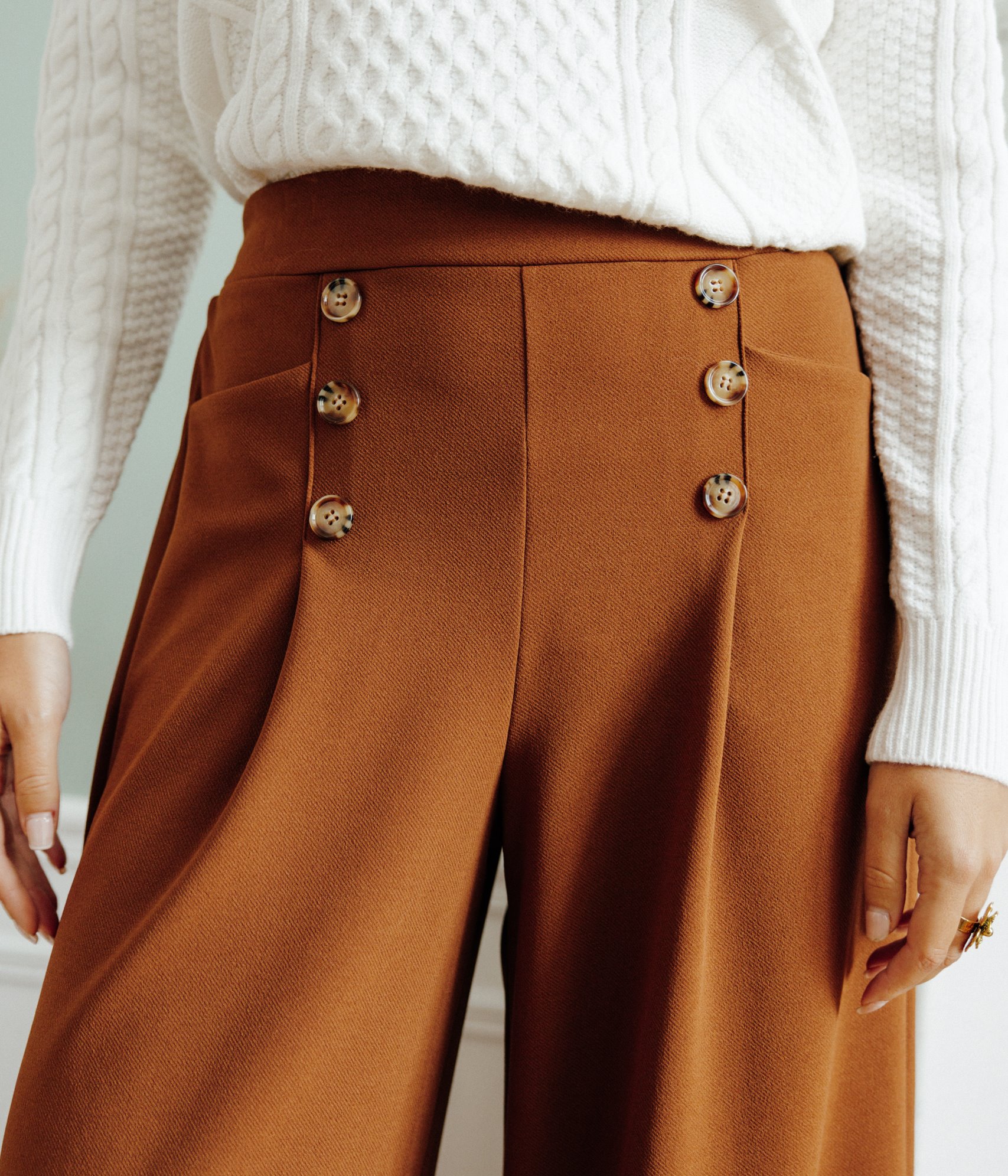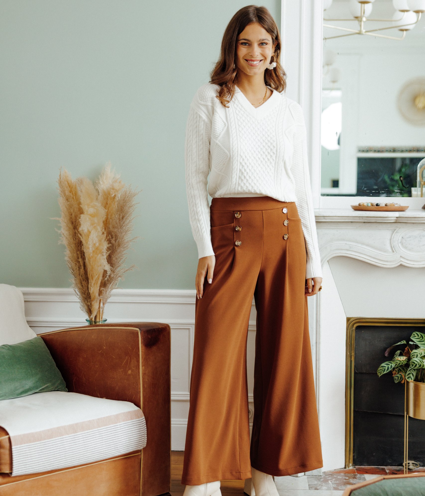 Pantalon large à taille élastiquée avec boutons. Coupe droite avec jambes larges. 2 poches devant. Coloris uni. Matière extensible. Taille élastiquée, plate devant. 2 rangées de 3 boutons décoratifs sous la taille devant. Pli creux sous chaque rangée de boutons. Coutures ton sur ton en finition.
