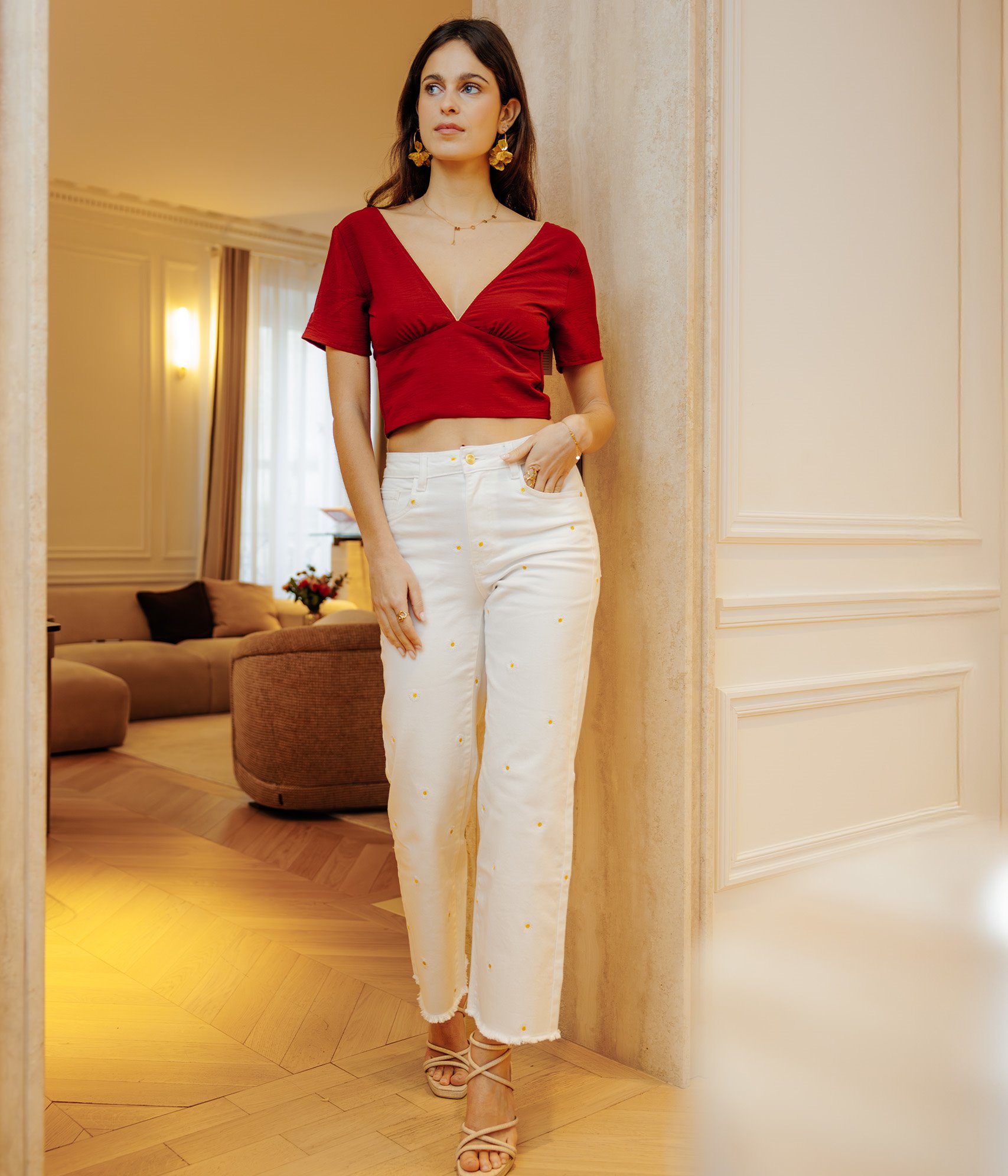 Pantalon en denim blanc avec broderies florales. Coupe droite avec une taille mi-haute. Longueur cheville. Finition effilochée au bas des jambes. 2 poches arrière plaquées et 2 poches italiennes devant. Fermeture par zip et bouton.
