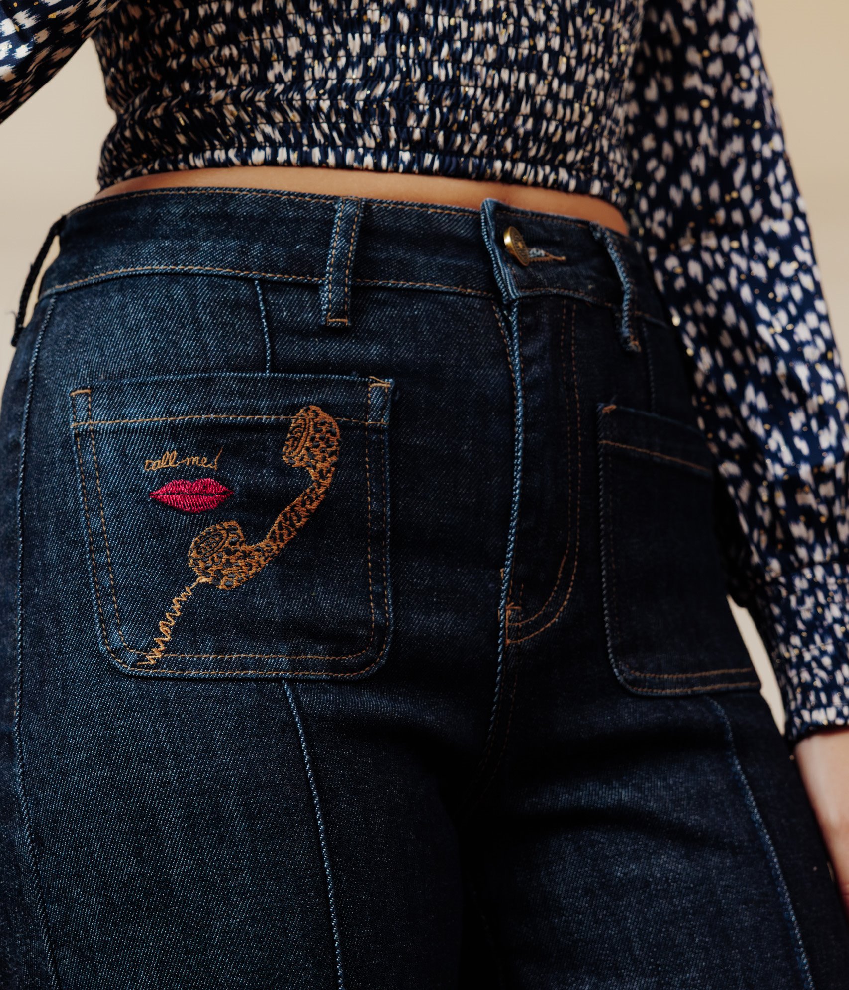 Jean large extensible 4 poches avec broderies. Coupe ample. Fermeture boutonnée et zippée. 2 poches plaquées devant et 2 poches plaquées au dos. Teinte unie. Denim extensible. Broderie combiné de téléphone façon léopard, bouche et message sur poche droite devant. Couture relief centrée devant les jambes effet pli marqué. Ceinture à passants. Surpiqûres contrastées.