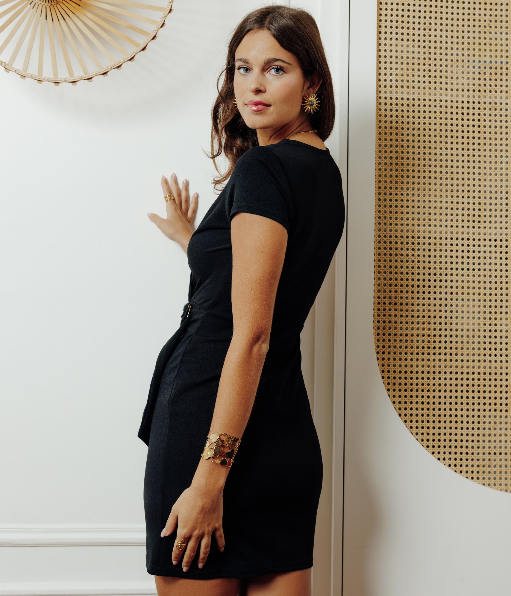 Cette petite robe fait partie des indispensables du vestiaire féminin. Robe courte avec effet drapé. Coupe droite courte. Longueur mi-cuisses. Manches courtes. Décolleté en V esprit cache-cœur. Coloris uni. Matière extensible. Effet drapé à la taille et boucle métallique ronde. Coutures ton sur ton en finition.