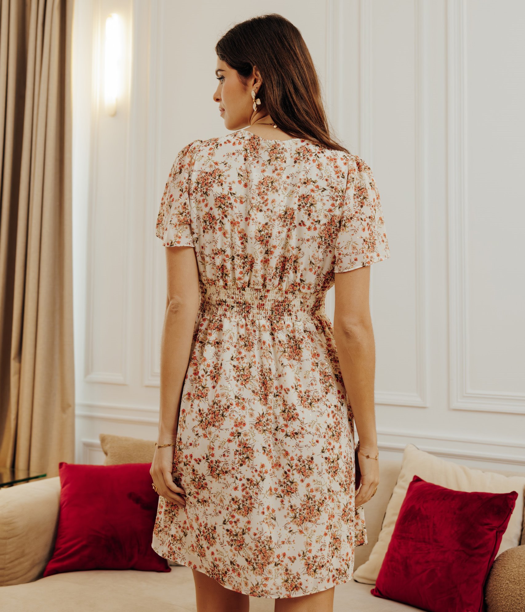 Robe effet corseté à manches courtes avec motifs floraux imprimés. Coupe cintrée courte. Manches courtes fluides non doublées. Décolleté V profond. Fleurs multicolores imprimées sublimées de petites taches métallisées. Voile doublé. Découpe drapée à petits boutons recouverts façon corset devant la taille. Dos de la taille élastiqué. Fronces devant les épaules, à la taille et sous la poitrine.