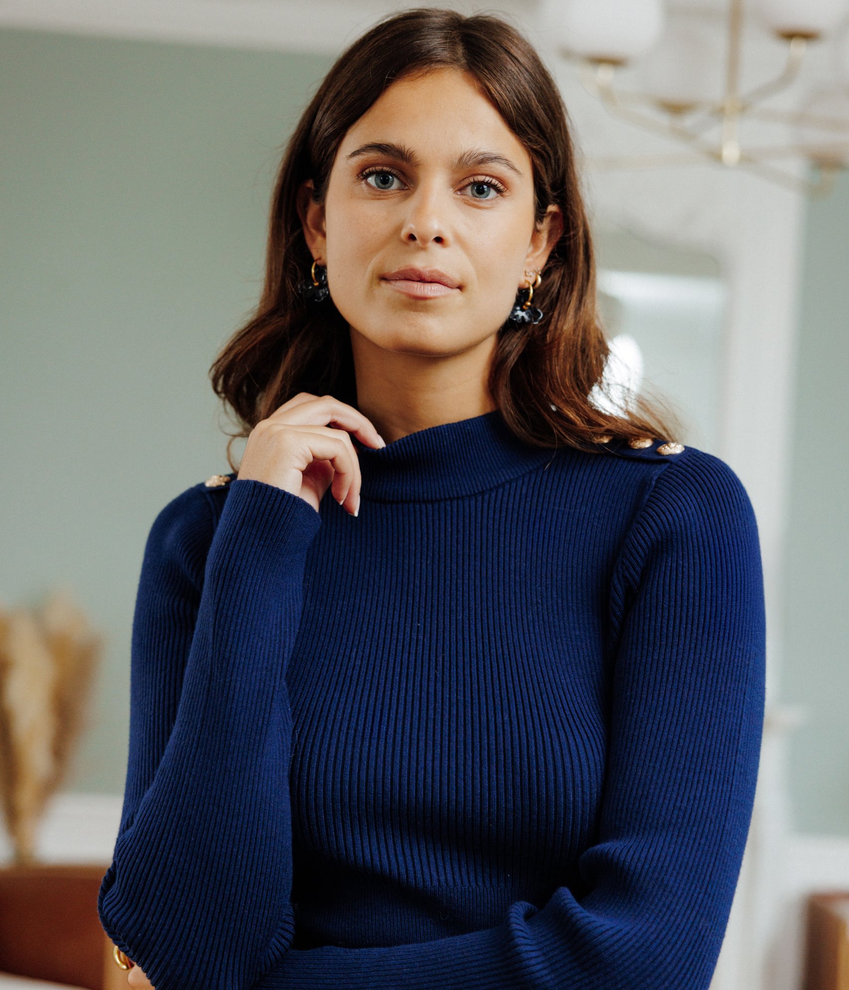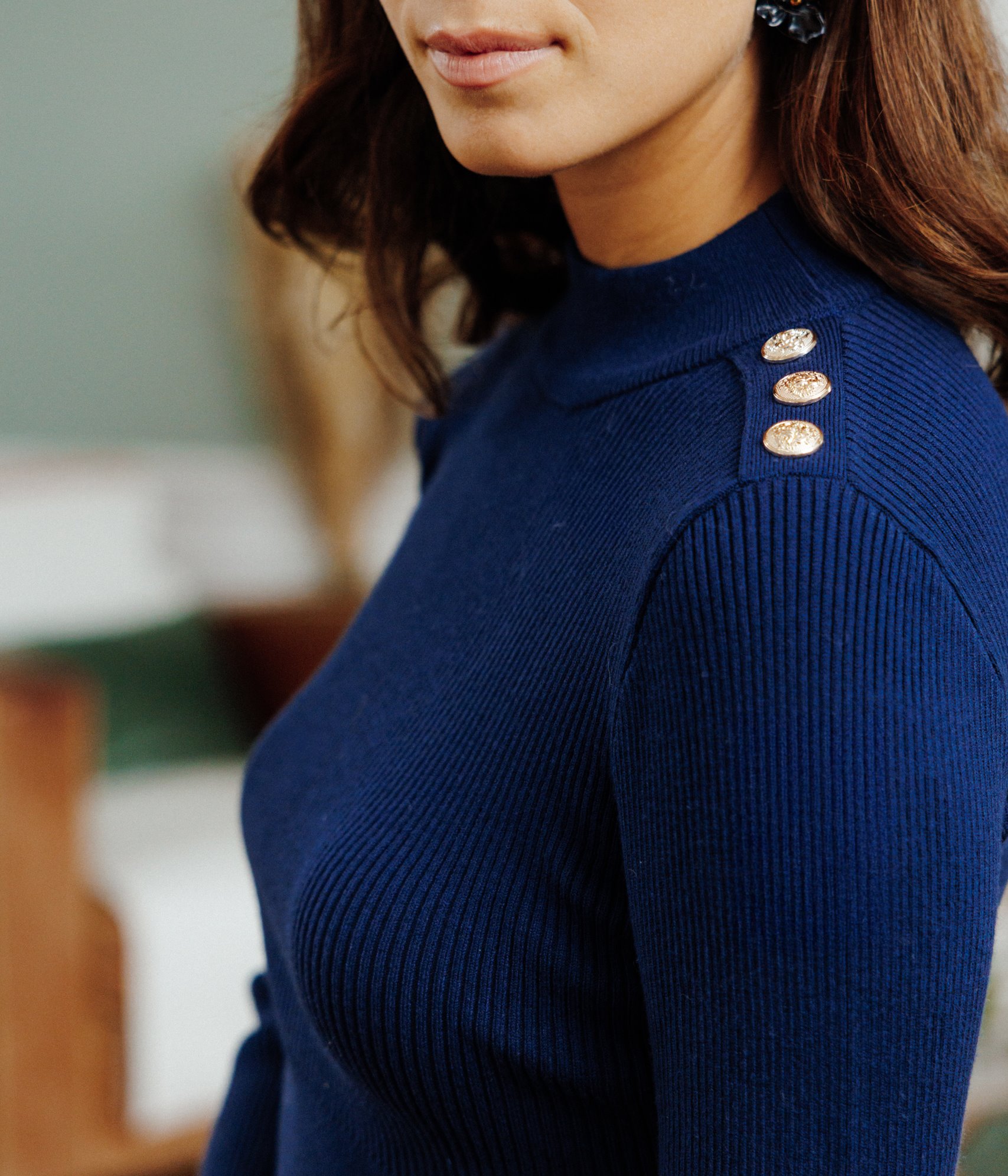 Robe ajustée en maille à côtes. Coupe près du corps. Longueur mi-cuisses. Manches longues à emmanchures droites. Col montant. Fine maille à côtes unie. Patte boutonnée décorative sur les épaules, ornée de boutons bijoux. Alliez confort et élégance en portant cette robe avec des bottines à talons.