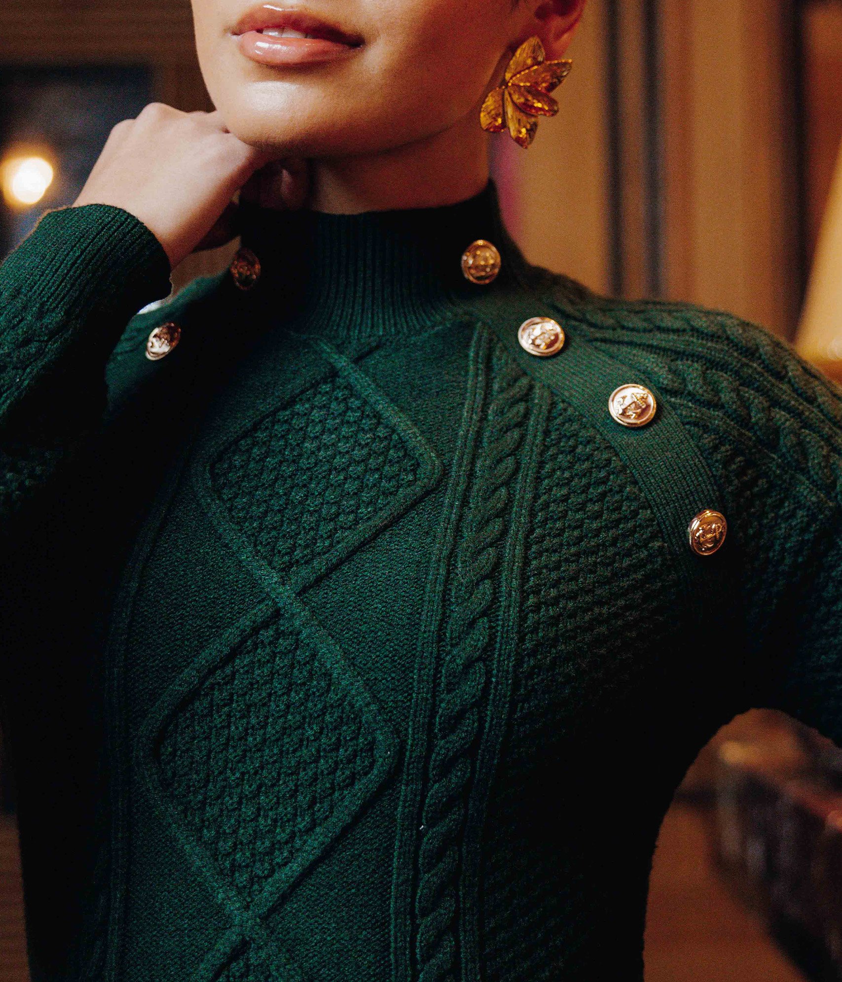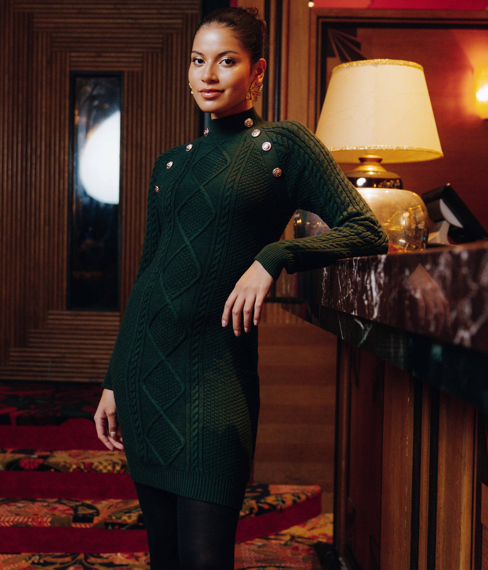 Robe pull courte à manches longues en tricot torsadé. Coupe ajustée courte. Manches longues. Emmanchures raglan. Col légèrement montant. Teinte unie. Maille torsadée devant et aux manches. Point fantaisie en relief au dos. Col, poignet et base en côtes. Maille jersey aux emmanchures. Fibres métalliques. Boutons décoratifs avec ancre marine embossée cousus sur les emmanchures devant.