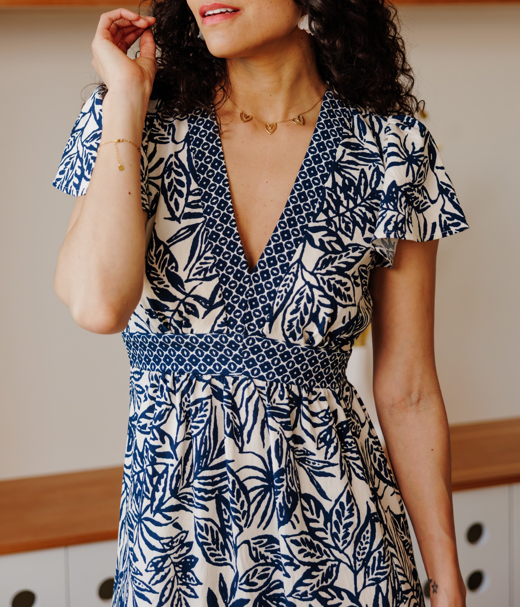 Notre mannequin Malaika mesure 1m78 et porte une robe taille 36/S.