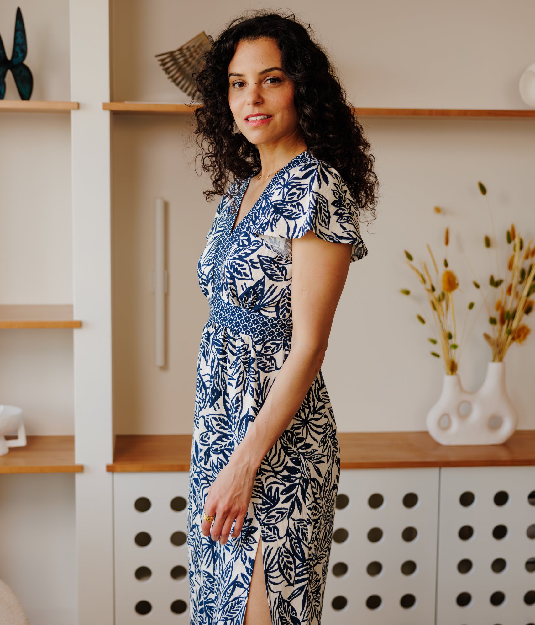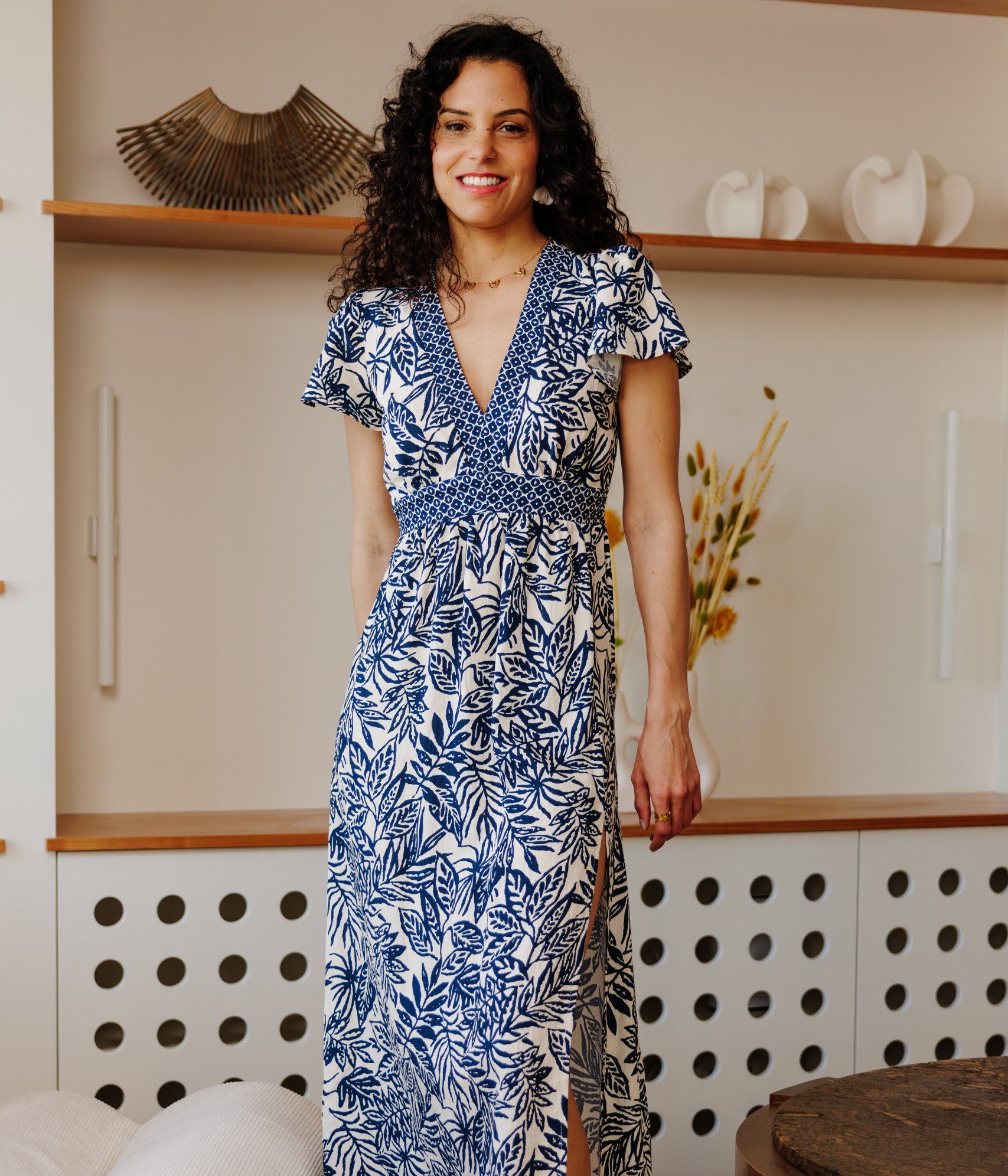 Robe longue imprimée avec fente. Coupe légèrement ajustée, avec découpe sous la poitrine. Longueur mi-mollets. Manches courtes papillon. Décolleté en V. Taille élastique au dos. Imprimé à motifs graphiques le long du décolleté et sous la poitrine. Imprimé à motif feuillage sur le reste du modèle. Robe bicolore. Longue fente sur le côté.