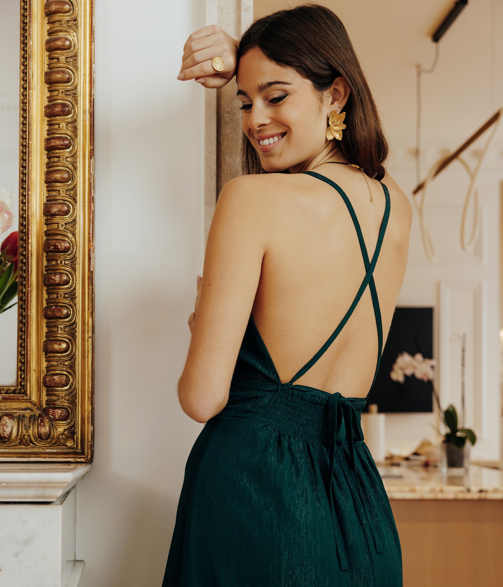 Robe longue dos nu à bretelles croisées au dos. Coupe cintrée longue. Fines bretelles. Décolleté V profond. Teinte unie. Voile lamé doublé à mi-cuisses. Bretelles croisées nouées à la taille au dos. Smocks au dos de la taille. Longue fente placée de façon asymétrique devant. Effet corset devant à la taille.