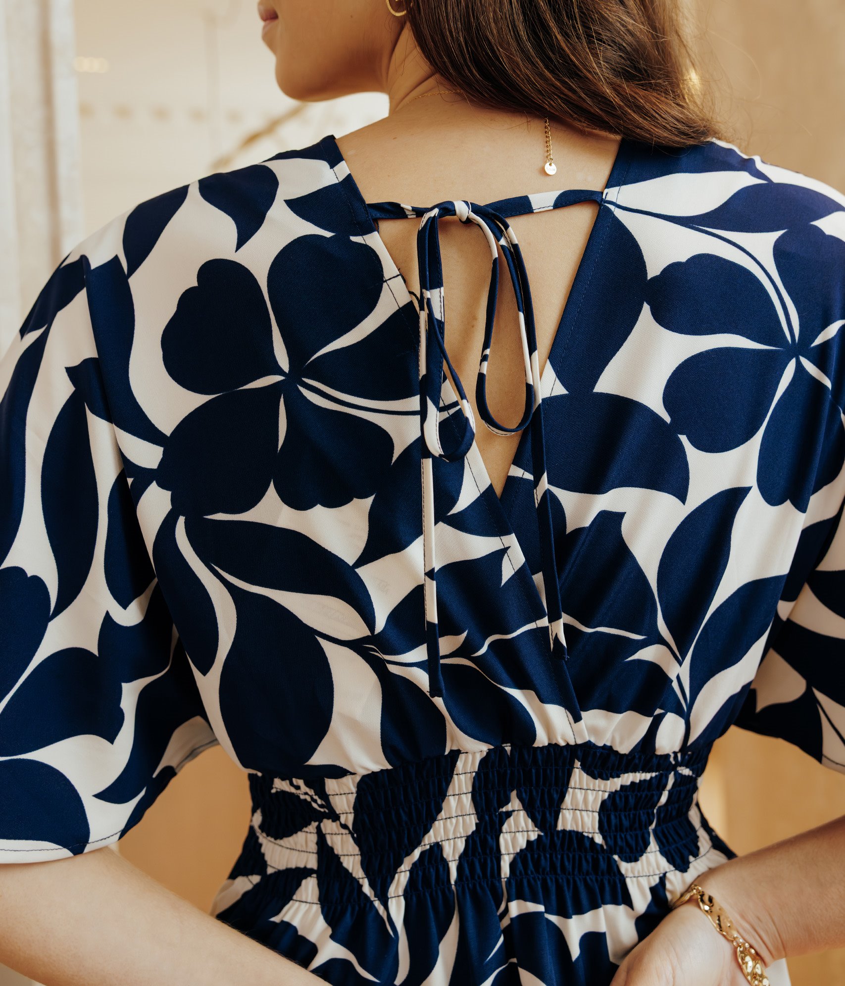 Robe longue à manches courtes et grands imprimés végétaux bicolores. Coupe cintrée longue. Manches courtes amples inspiration kimono. Décolleté cache-cœur. Décolleté V croisé au dos avec lien à nouer. Grosses fleurs et feuilles imprimées en tons bicolores. Matière fluide. Taille smockée.