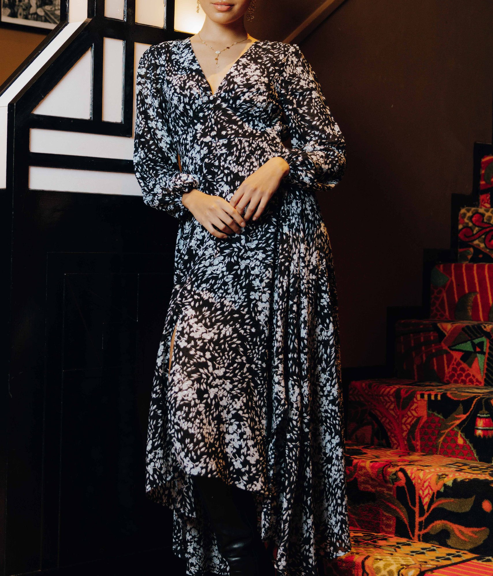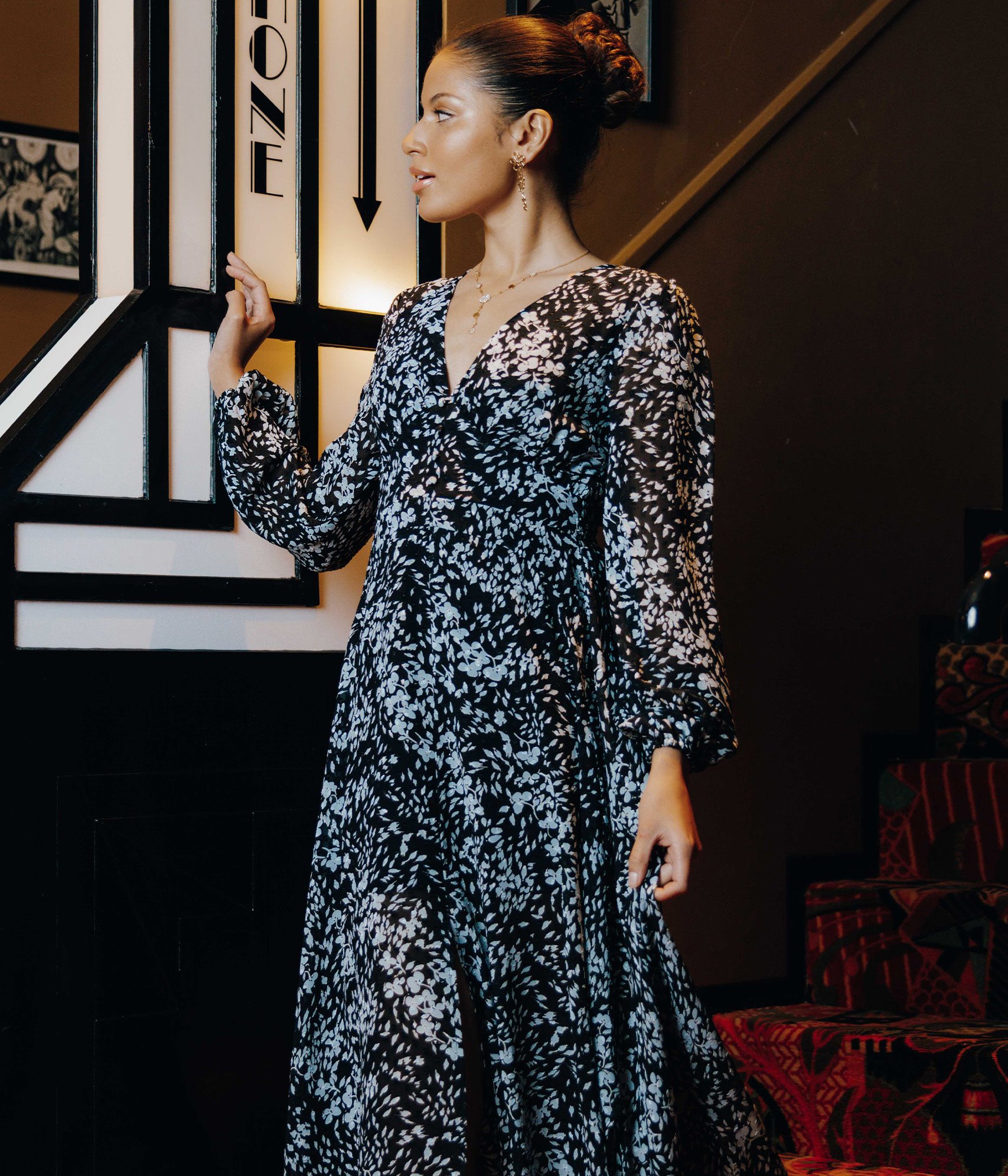 Robe longue imprimée. Coupe cintrée. Longueur chevilles. Manches longues avec poignets élastiqués. Décolleté en V. Imprimé à motif floral sur l'ensemble du modèle. Bicolore. Modèle doublé. Longue fente sur le devant du modèle. Portez cette jolie robe longue imprimée avec des bottes hautes.