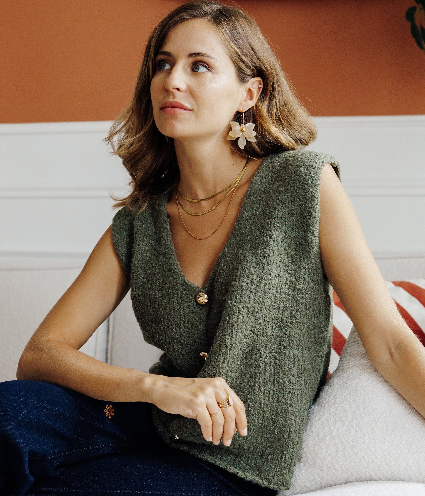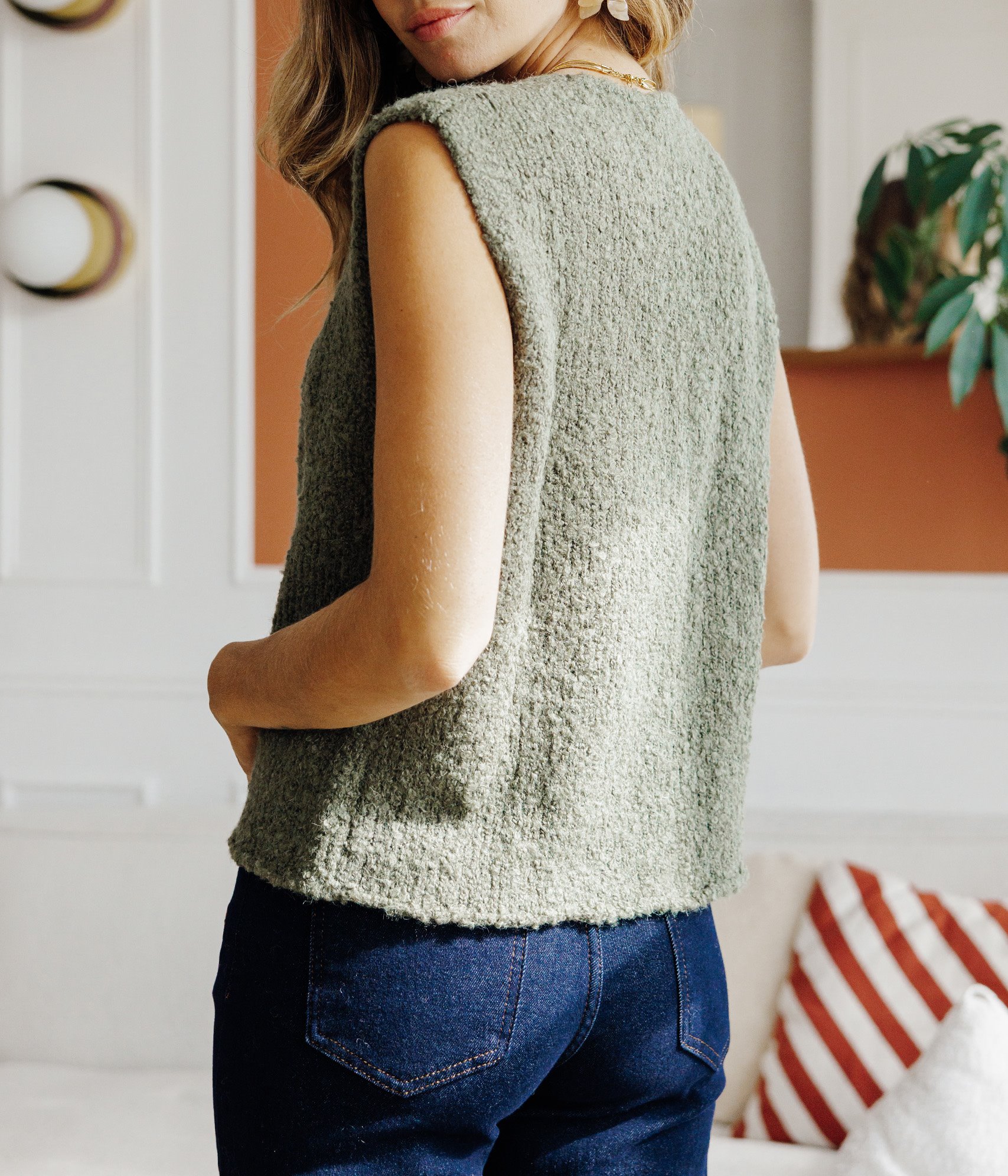 Notre mannequin Carla mesure 1m74 et porte un gilet taille 36/S.