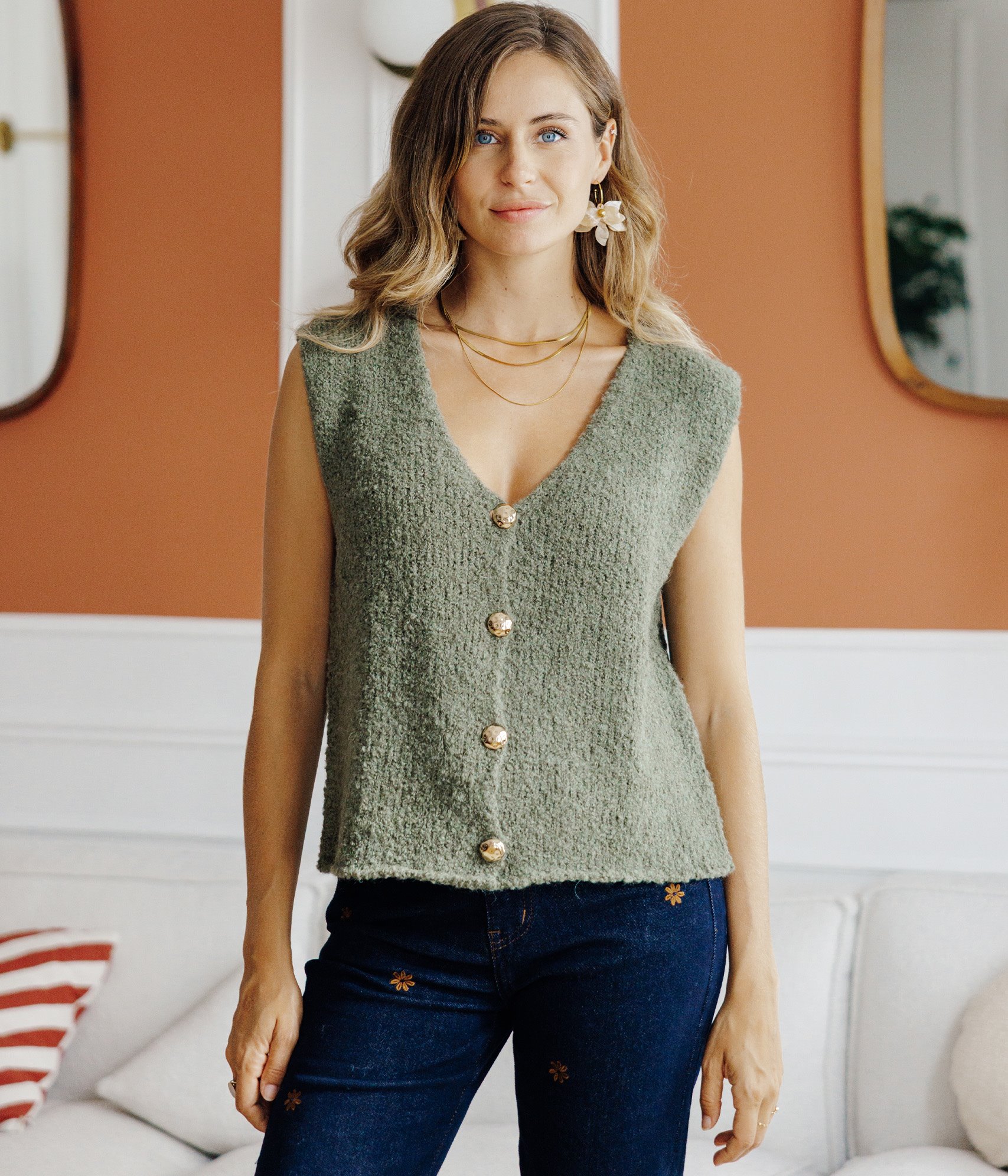 Gilet uni sans manches à boutons fantaisie en maille bouclettes. Coupe droite. Sans manches. Profond décolleté V. Fermeture à boutons métalliques bombés et martelés. Teinte unie. Tricot en maille effet bouclettes. Base en finition droite. Composition contenant de la laine et de l'alpaga.