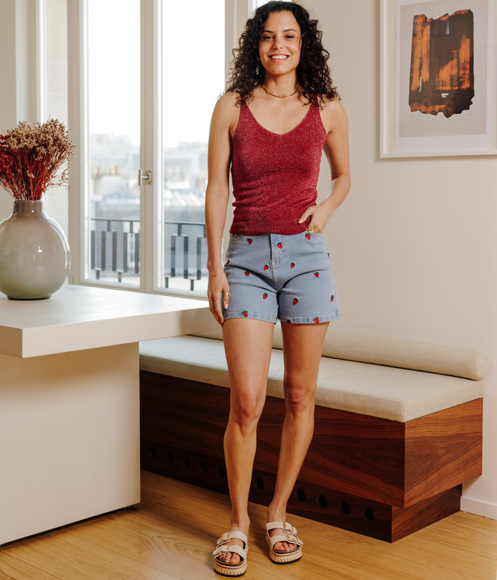 Laissez-vous séduire par ce short en jean à l'imprimé frais et gourmand. Short en jean avec fraises brodées. Coupe droite courte. Fermeture par un zip et un bouton. 2 poches cavalières sur le devant. 2 poches plaquées au dos. Fraises brodées sur l'ensemble du modèle. Matière extensible. Coutures discrètes en finition.