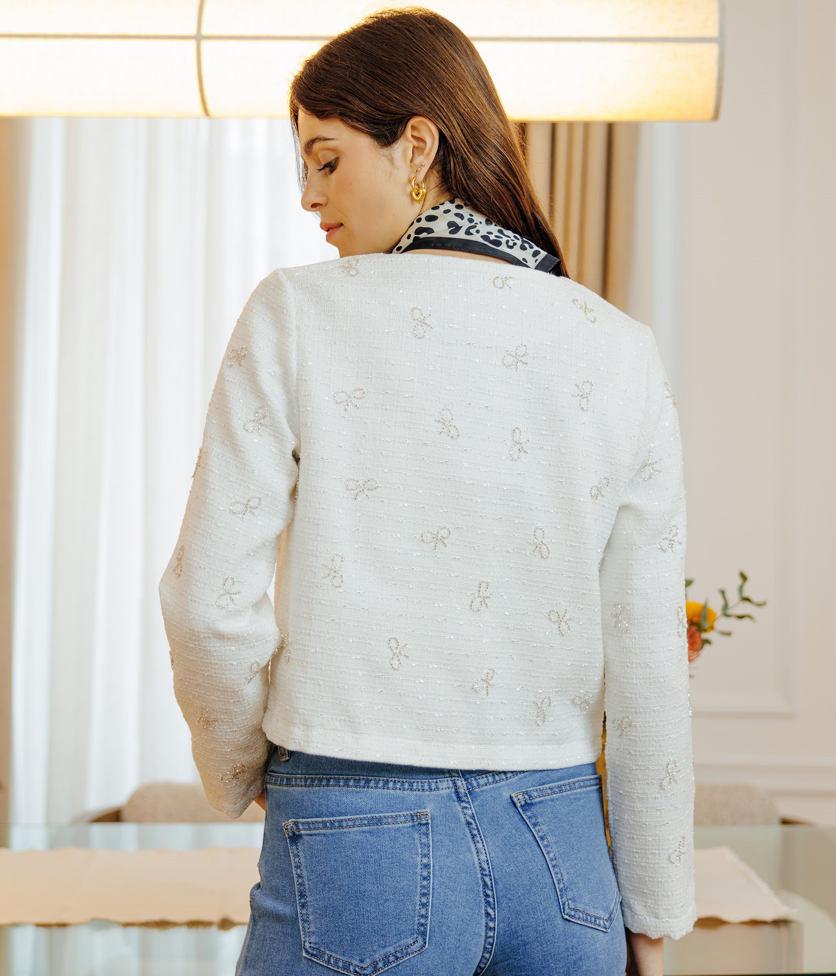 Veste courte à manches longues avec col droit. Coupe droite. Fermeture par un crochet à l'avant. TIssu pailletté et noeuds en perles sur l'ensemble du modèle. Manches longues avec finition en bord-côte. Coloris uni. Longueur au niveau de la taille.