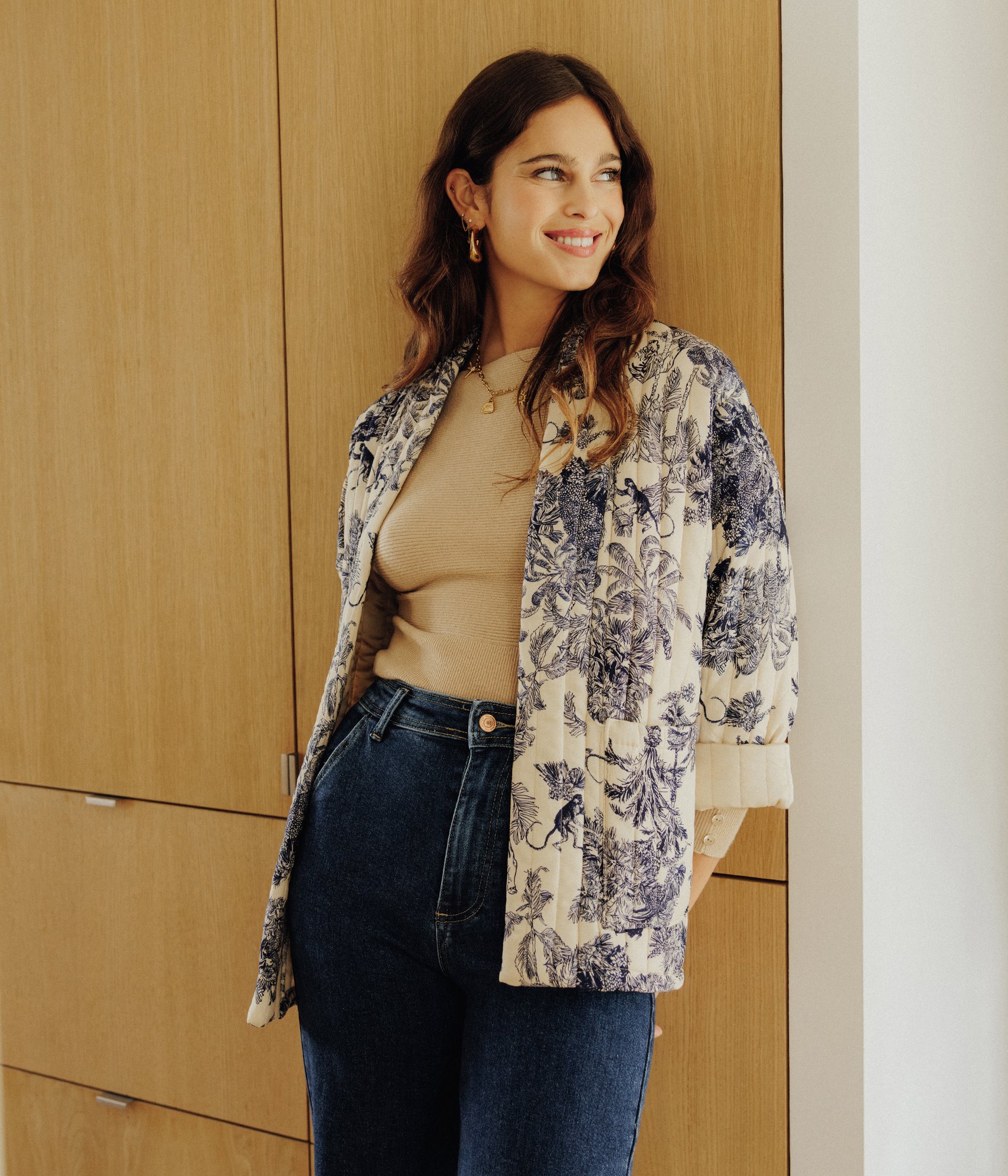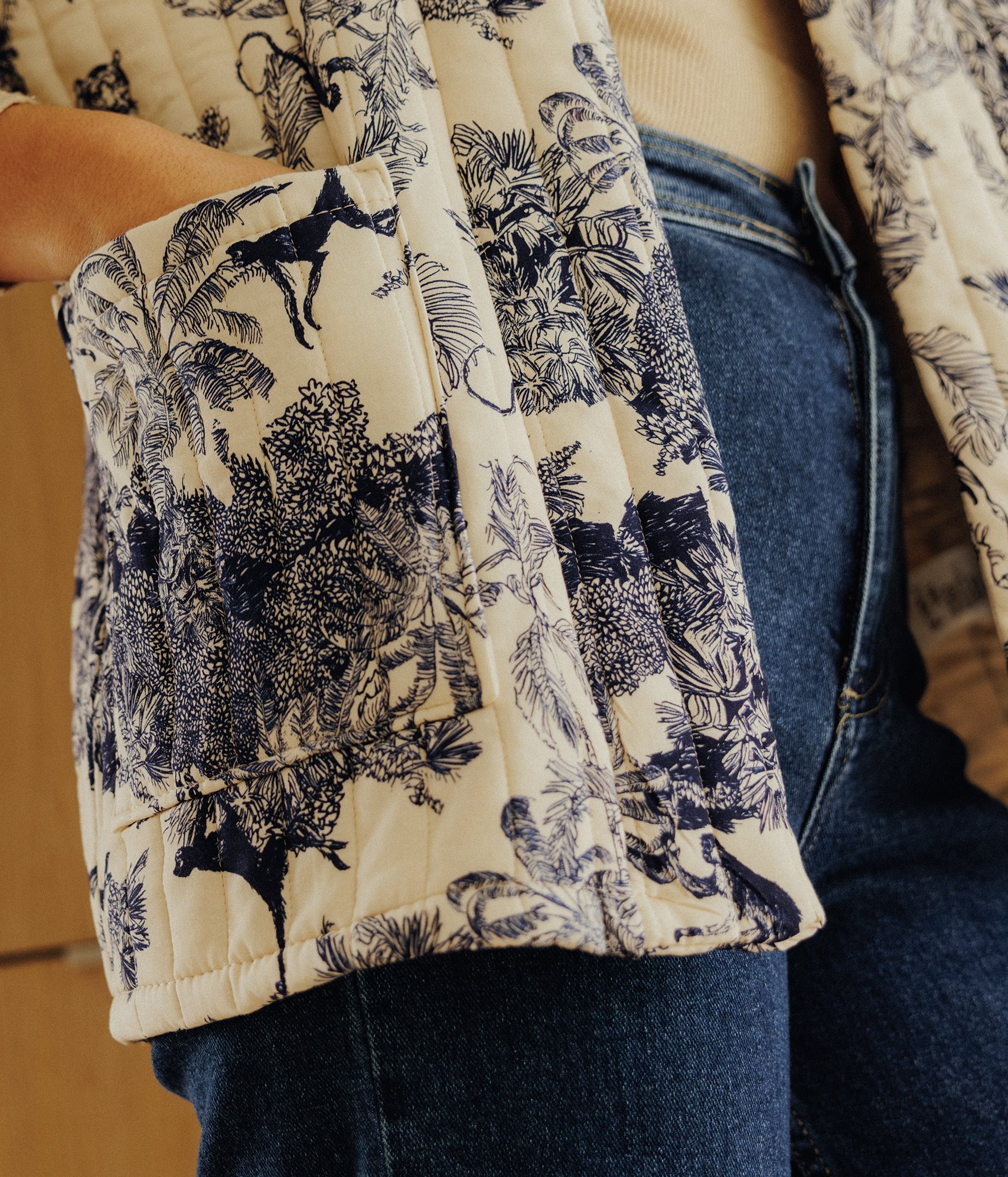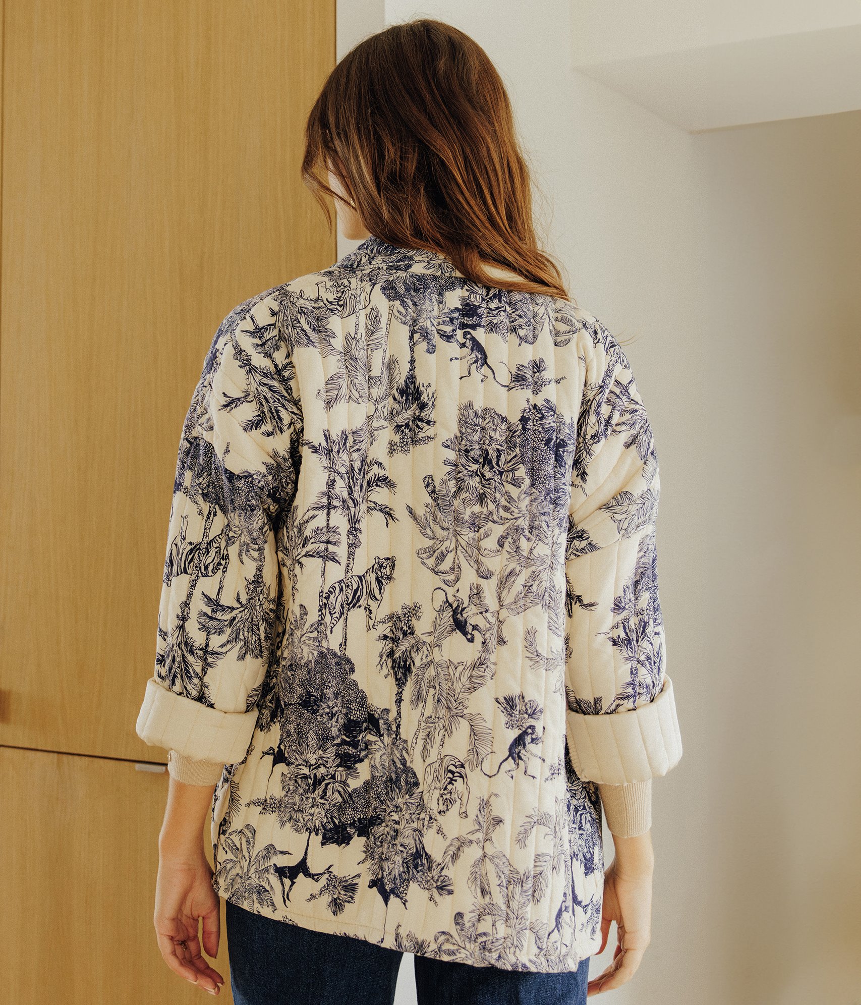 Veste matelassée sans col imprimé jungle. Coupe oversize courte. Manches longues larges sur emmanchures descendues. Sans col. Sans fermeture. 2 grandes poches plaquées à l’avant. Imprimé bicolore, motif jungle et animaux sauvages sur l’ensemble. Tissu matelassé. Poignets à revers uni. Finitions ourlées.